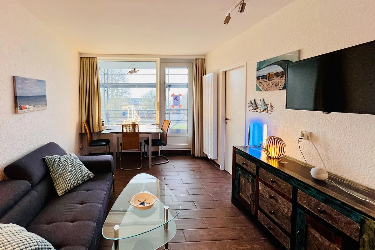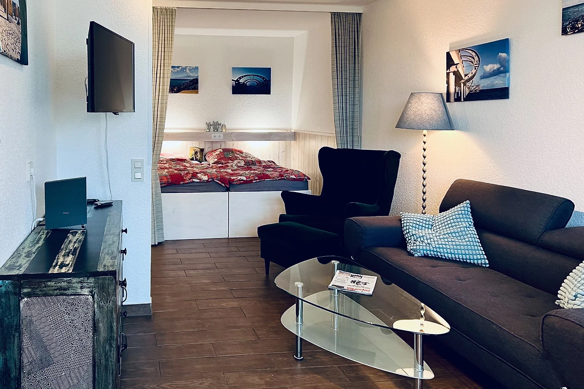 Die Wohnung ist ideal für 1-4 Personen gestaltet. Im Wohnraum befindet sich eine gemütliche Schlafkoje mit indirektem Licht und Nachttisch, die durch einen Vorhang optisch vom Wohnbereich getrennt werden kann. Ein separates Schlafzimmer mit Einzelbett bietet zusätzlichen Komfort und Flexibilität.
