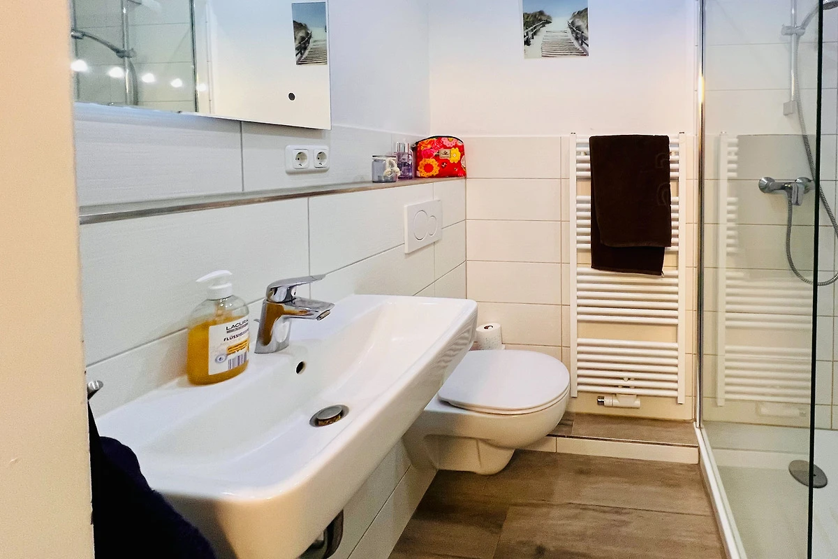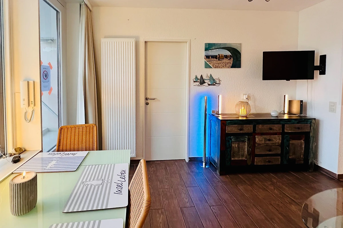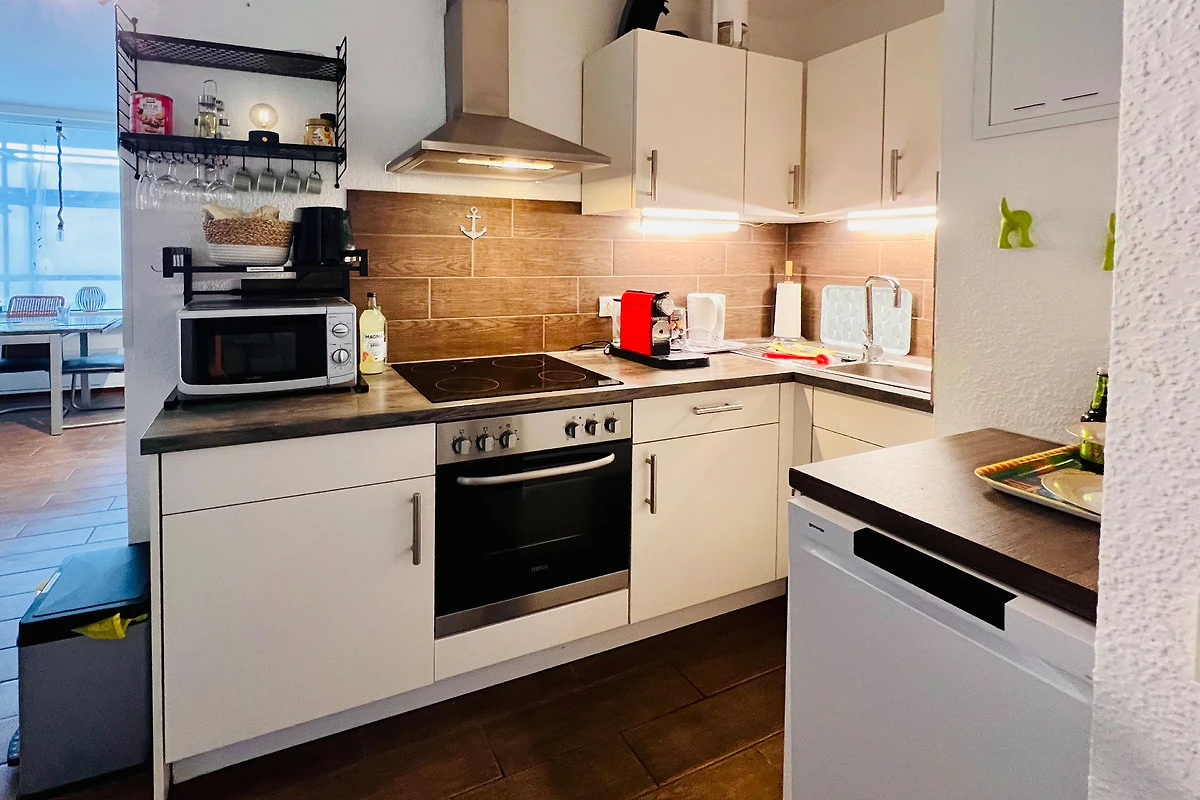 Das helle, moderne Duschbad mit WC ist innenliegend. Für die Selbstversorgung steht Ihnen eine integrierte, sehr gut ausgestattete Küchenzeile zur Verfügung inkl. Nespresso-, Pad- oder Kaffeemaschine und Wasserkocher, je nach Belieben - perfekt für ein entspanntes Frühstück, oder kleine Gerichte für zwischendurch oder nach einem Tag am Meer. Sie sind in wenigen Minuten vom Strand im Appartment, ideal, wenn Sie kurze Wege lieben. Falls Sie was für den Strand vergessen haben oder zwischendurch was zum Snacken holen wollen, kein Problem durch die Nähe zur Promenade. Seit kurzem gibt es einen direkten Strandzugang.