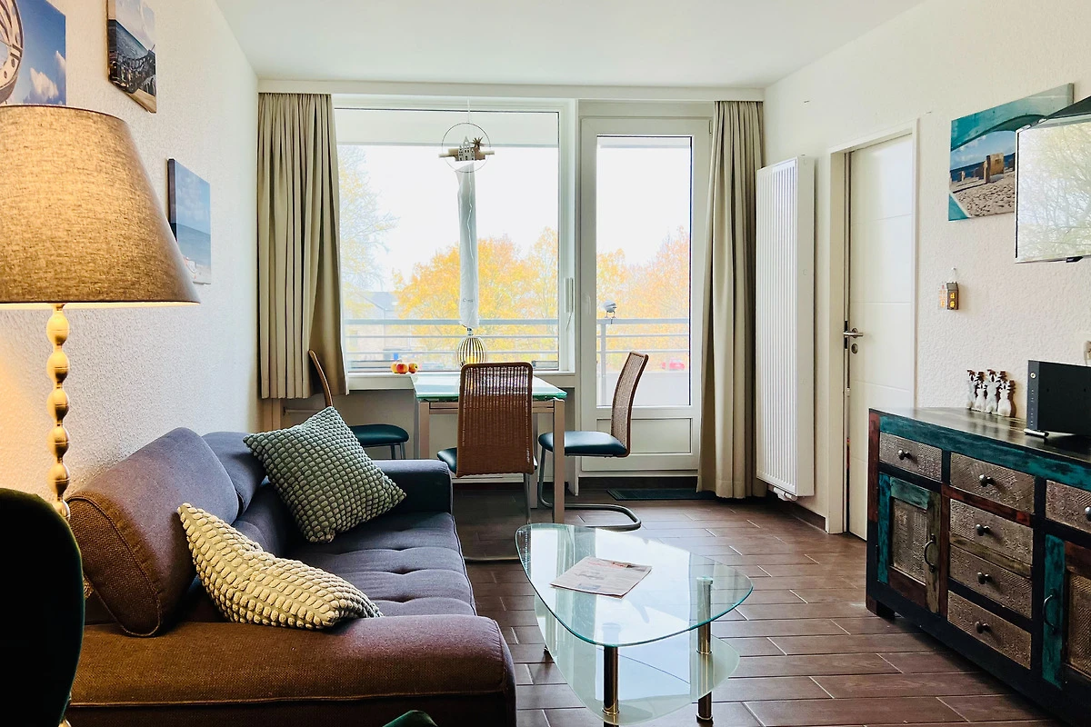 Diese charmante, gemütlich eingerichtete Ferienwohnung, die mit einem grossen Balkon zur Meerseite ausgestattet ist, liegt nur wenige Schritte vom kleinen Deich und der schönen Promenade von Kellenhusen entfernt. Sie befindet sich in etwa auf Höhe des Restaurants Casa Mia und bietet einen wunderbaren Blick aufs Meer, sanft gefiltert durch die Baumlandschaft vor der Promenade.