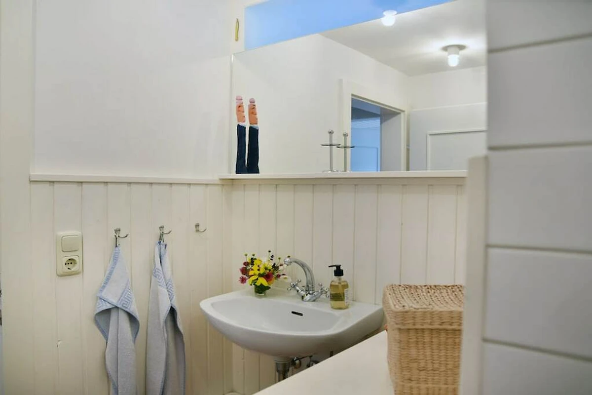 In der 1. Etage: (offene Küche(, , , , Kochnische, Bibliothek, TV, Esstisch, Herd, Wasserkocher, Toaster, Kochherd, Kaffeemaschine, Spülmaschine, Kühlschrank, Tiefkühlschrank, Hochstuhl, Spielzeug), Schlafzimmer(, , Bibliothek, Doppelbett), Badezimmer(, Dusche, Waschbecken, Föhn), Abstellraum(, ))
