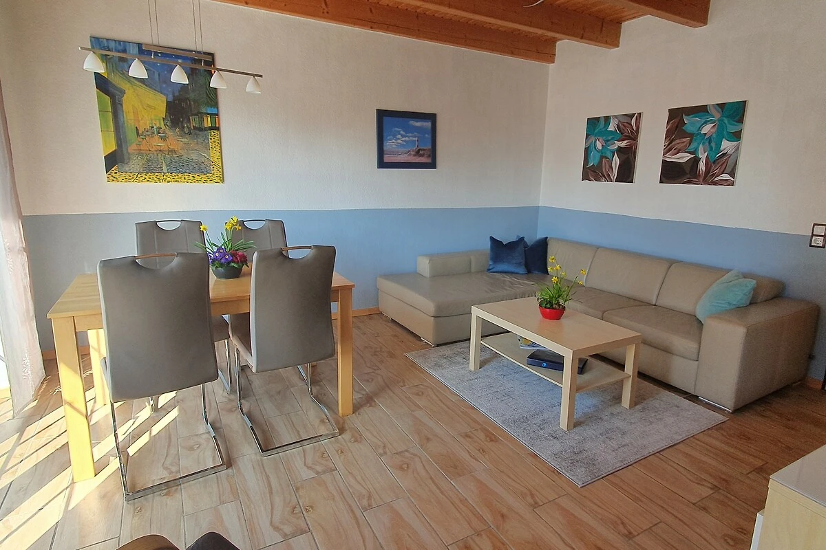 Unsere modern eingerichtetes Ferienhaus verfügt über zwei schöne Schlafzimmer, ein Wohnzimmer mit Wohnküche und ein geräumiges Badezimmer. Der gemütliche Wohnbereich lädt mit TV, einem moderen Ledersofa und kostenlosem WLAN zu entspannten Abenden ein.