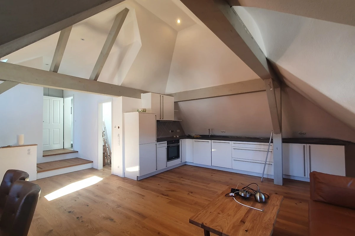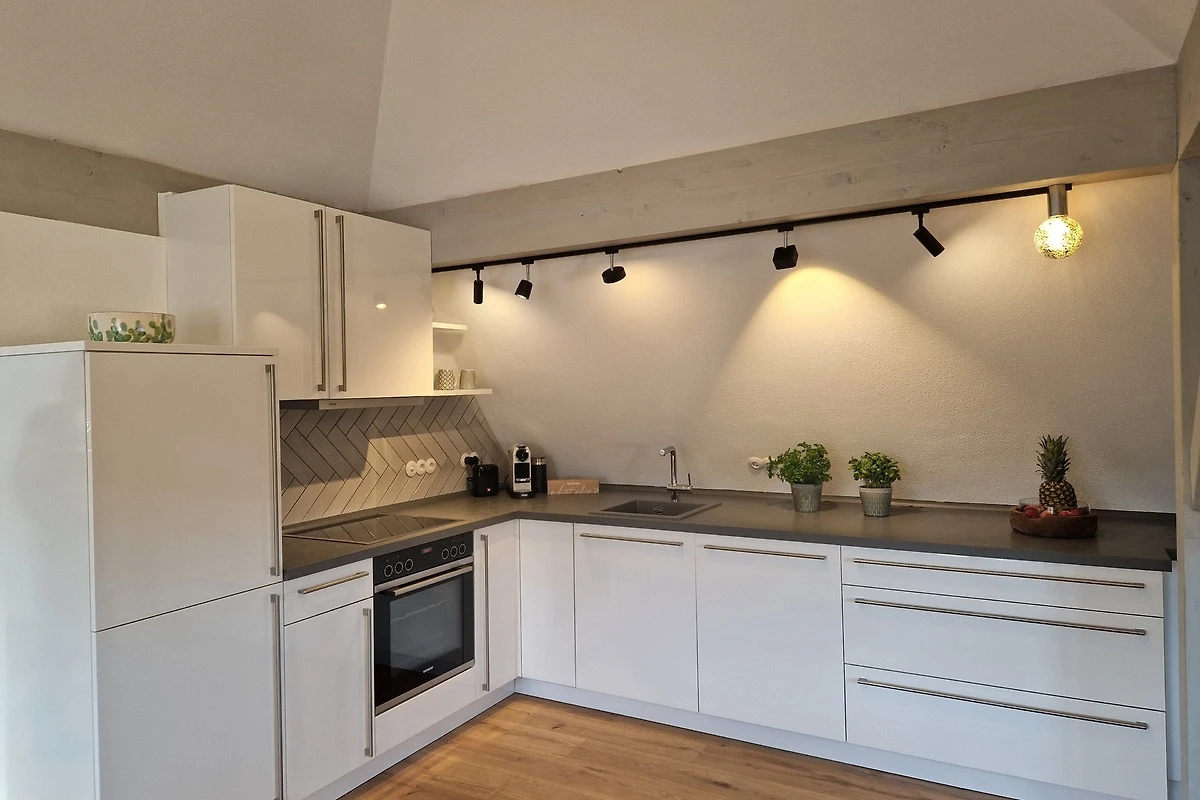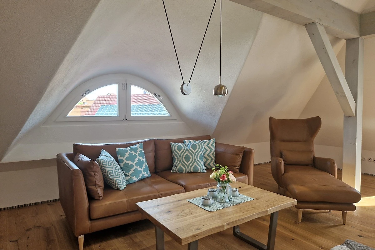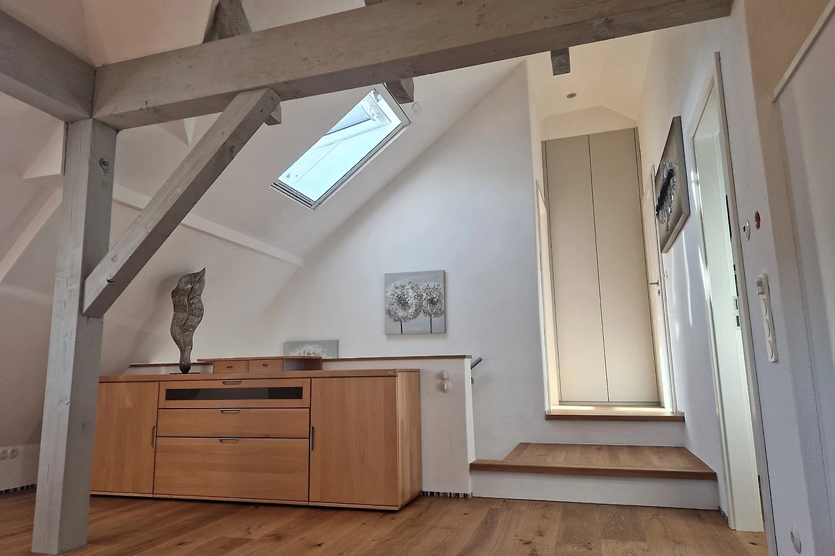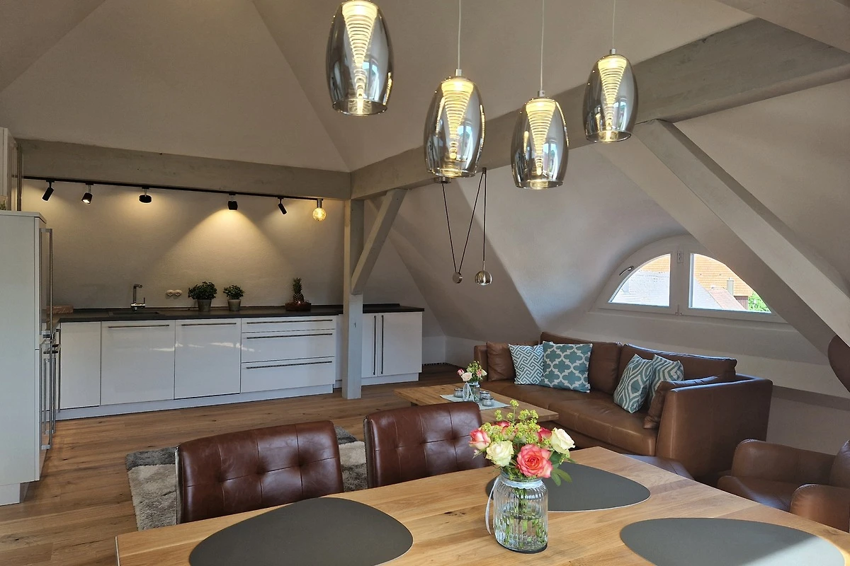 Die stilvoll sanierte Dachgeschosswohnung "gute Stube" bietet Eichenparkett, Kalkputz und kostenfreies WLAN für ein gesundes Wohnklima. Sie verfügt über ein grosszügiges Schlafzimmer mit Boxspringbett(180x200cm) sowie ein separates Zimmer mit 140x200 cm-Bett für einen Erwachsenen oder zwei Kinder. Die geräumige Wohnküche mit Ledersofaecke, Essbereich und moderner Ausstattung lädt zum Verweilen ein. Ein Bad mit Regendusche, Waschtrockner und eine E-Ladestation ( gegen Gebühr ) im Hof ergänzen das komfortable Angebot.Zeige weniger