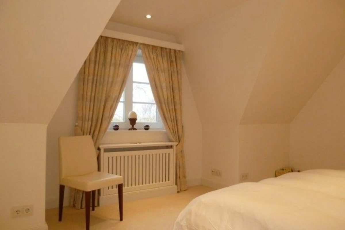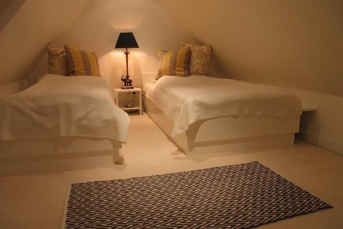 Über eine bequeme Treppe erreicht man das 2. Schlafzimmer im Dachgeschoss mit 2 überbreiten Betten und TV-Anschluss.