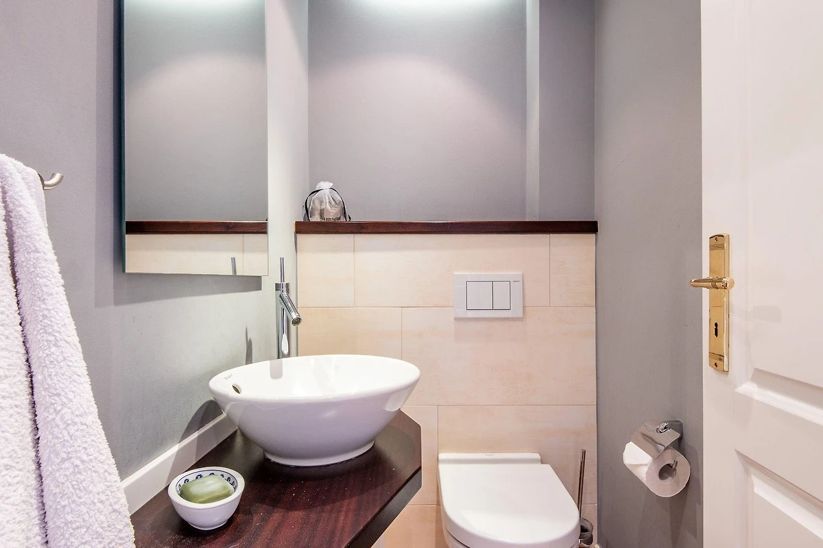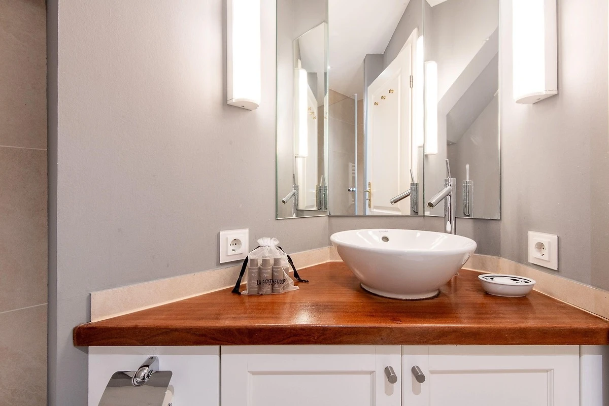 Daneben liegendes neues Bad mit vielen edlen Details, grosser Dusche, Schrank und Handtuchheizkörper.