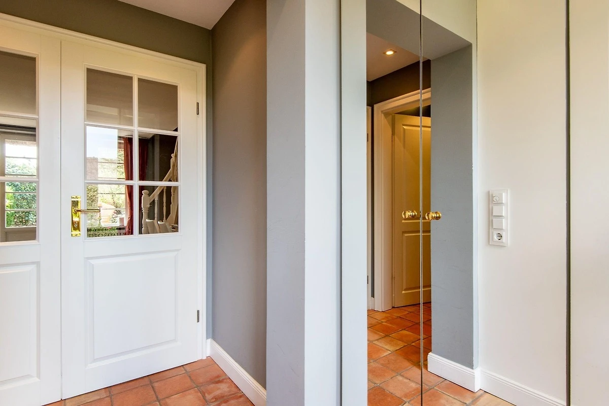 Grosser Flur mit geräumigem Schrank und grossen Spiegelflächen. Modernes edles Gäste-WC im EG.