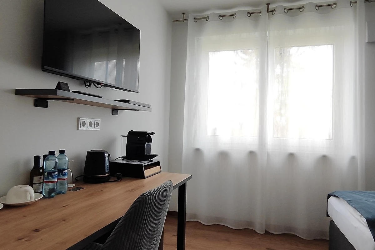 Darüber hinaus verfügt das Zimmer über einen kleinen Kühlschrank, einen Tisch sowie eine Kaffeemaschine und einen Wasserkocher, damit sich die Gäste jederzeit selbst Kaffee oder Tee zubereiten können. Ein Safe ist ebenfalls vorhanden, um Wertgegenstände sicher zu verwahren. Für Unterhaltung und optimale Vernetzung stehen WLAN, ein CAT-Internetanschluss und Kabel-TV zur Verfügung. Wenn Sie ein Babybett benötigen, können wir Ihnen dieses gerne zur Verfügung stellen, um Ihren Aufenthalt noch komfortabler zu gestalten.