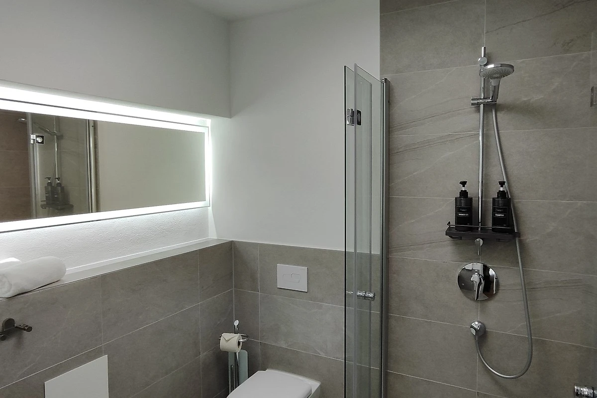 Das moderne Badezimmer bietet eine funktionale Ausstattung mit einer Dusche, einem Waschbecken, einer Toilette und einem Fenster, das auch hier für angenehmes Tageslicht sorgt. Hochwertige sanitäre Anlagen, frische Handtücher und ein Haartrockner stehen bereit, sodass die Gäste bestens versorgt sind.