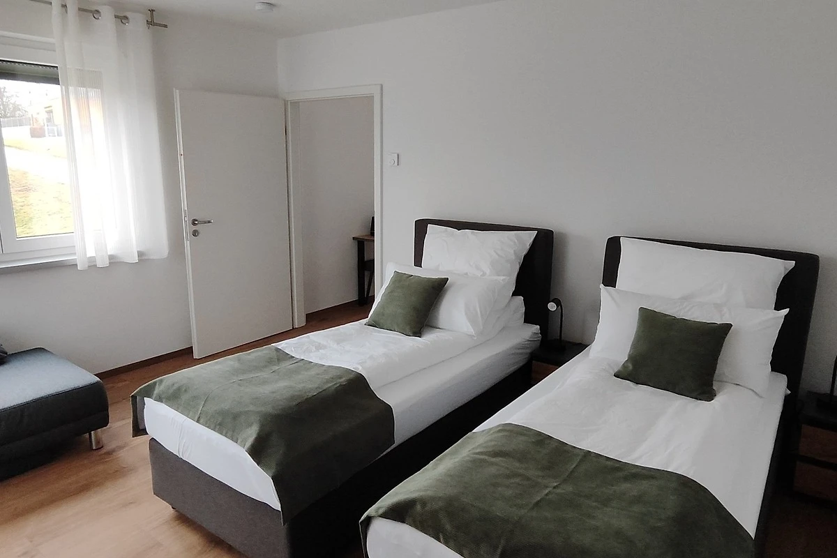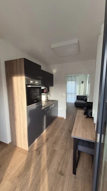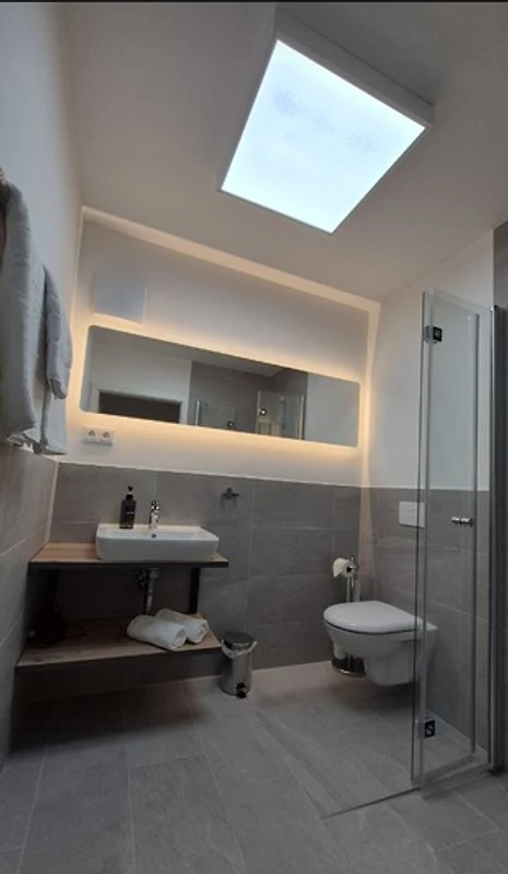 Das Apartment verfügt über ein eigenes Schlafzimmer mit einem gemütlichen Bett sowie ein modernes Badezimmer mit Dusche und WC. Handtücher und Bettwäsche sind bereits bereitgestellt, sodass Sie sich direkt wohlfühlen können.