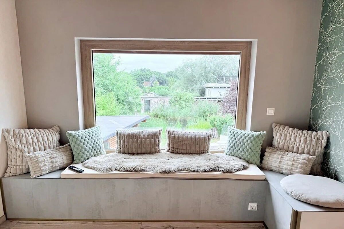 Große Panoramafenster eröffnen traumhafte Ausblicke – tagsüber auf den Naturteich, nachts auf ein funkelndes Sternenzelt. Ob vom gemütlichen Loungesofa oder direkt aus den Betten: Hier genießen Sie Natur hautnah.
