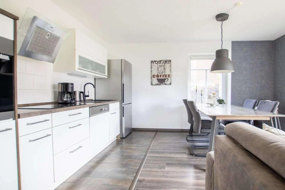 Im Erdgeschoss befindet sich ein geräumiges Schlafzimmer mit Doppelbett, das moderne Duschbad/ WC sowie der großzügige Wohnraum mit offener Küche. Die Küche ist mit allem ausgestattet, was so gebraucht wird (z.B. E-Herd mit Ceranfeld, Backofen, Geschirrspüler, Kaffeemaschine).