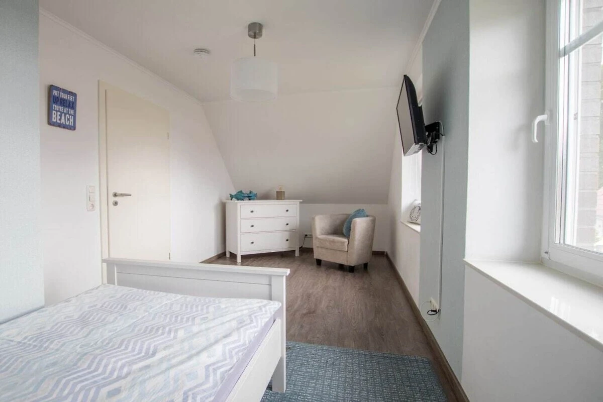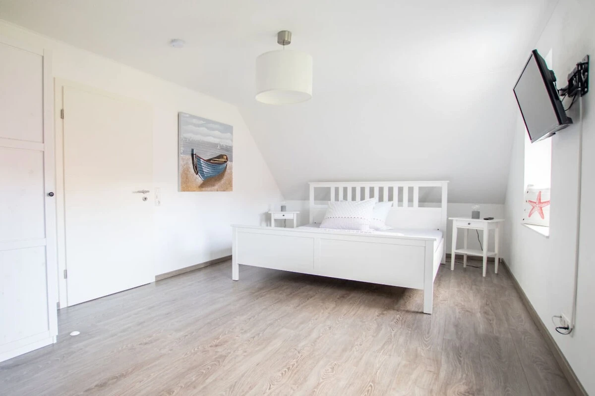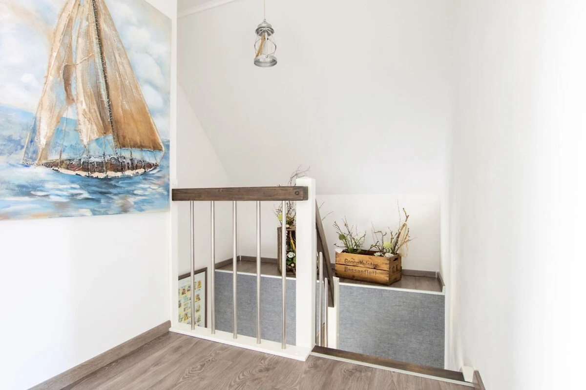 Über die Treppe im Wohnzimmer geht es in die 1. Etage. Dort warten zwei weitere großzügige Schlafräume, davon ein Raum mit einem Einzelbett.