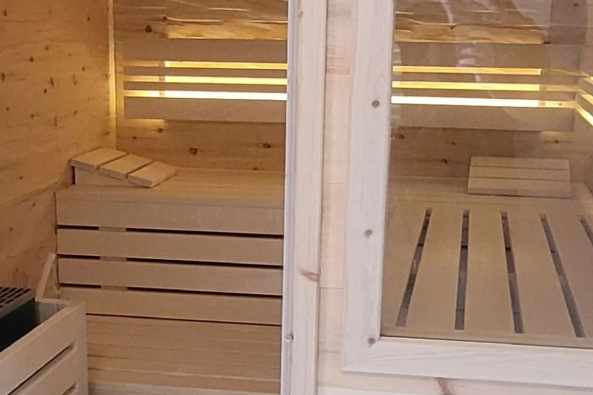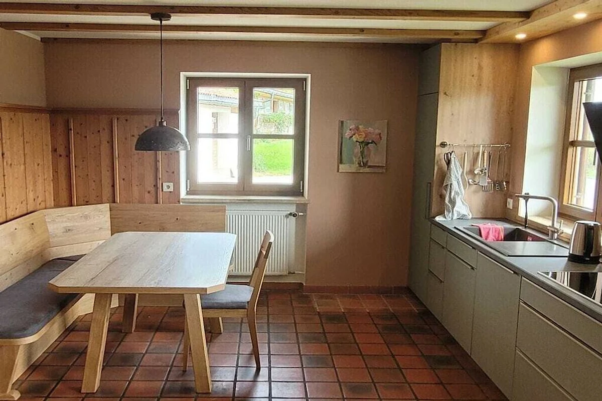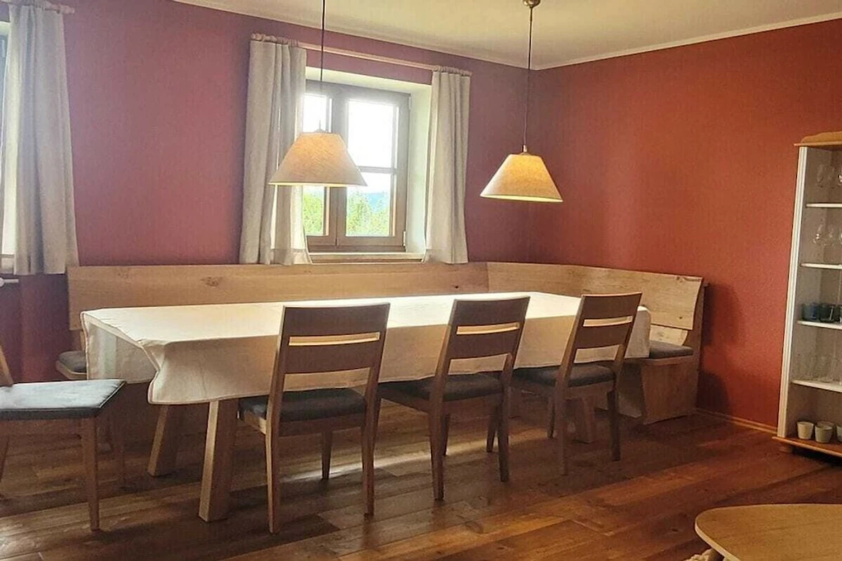 Das Wohnzimmer im EG mit großem Tisch für 10 Personen, einem gemütlichen Sofa, Kachelofen und TV hat direkten Zugang zur neu eingebauten Küche mit Tisch und Eckbank. Die Zirbenholz-Sauna mit Dusche im EG bietet Platz für 3 bis 4 Personen.