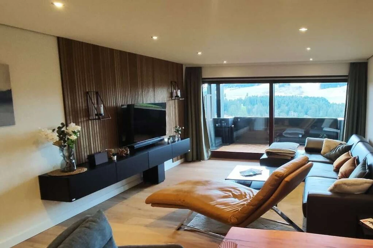 Der Wohnraum mit Koch- und Essbereich ist mit einer Relaxliege, einem Lowboard, 55" LED-Fernseher mit weipu.tv-Stream über Apple-TV, Sound-System, Internetradio, Hochfloor-Teppich und einem gemütlichen Ecksofa mit Ottomane ausgestattet.
