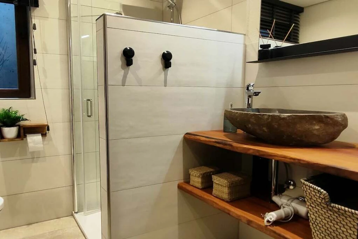 Durch den Flur mit Garderobe, Garderobenschrank und Sitzbank gelangt man in das exklusive Duschbad mit ebenerdigen Duscheinstieg, Regendusche und Flussstein-Waschtisch,