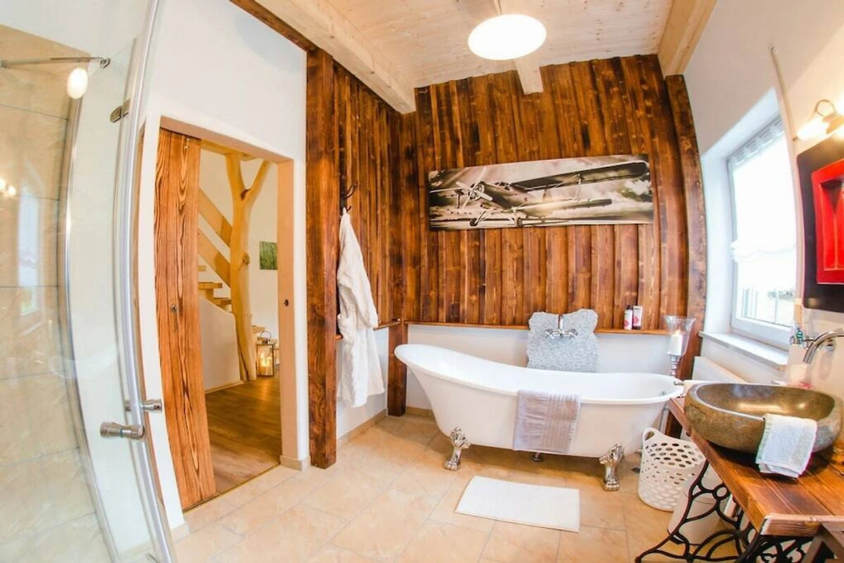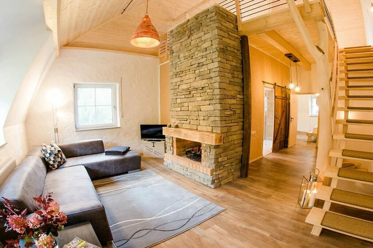 Im Obergeschoss können Sie von der großen Couch, direkt am gemauerten Kamin mit Blick in den offenen Dachgiebel entspannen und die besondere Wohnatmosphäre genießen. Daneben befindet sich im Obergeschoss ein romantisches Schlafzimmer handgefertigt aus 150 Jahre alten Holzbalken sowie ein besonderes Badeerlebnis mit einem großen Scheunentor als Eingangstüre, eine freistehenden Wanne im viktorianischen Stil und einer großzügigen Dusche sowie ein separates WC im Hüttenstil. Ab 2020 steht Ihnen unser Wellnessbereich zur Verfügung.