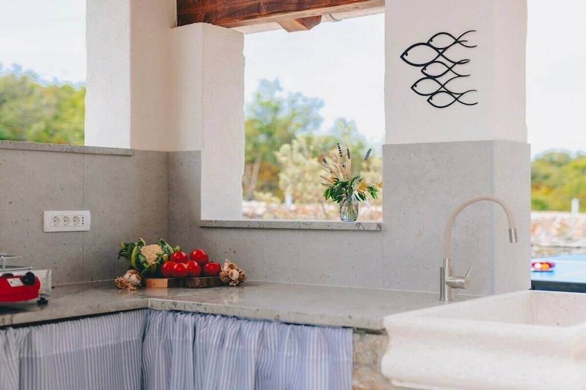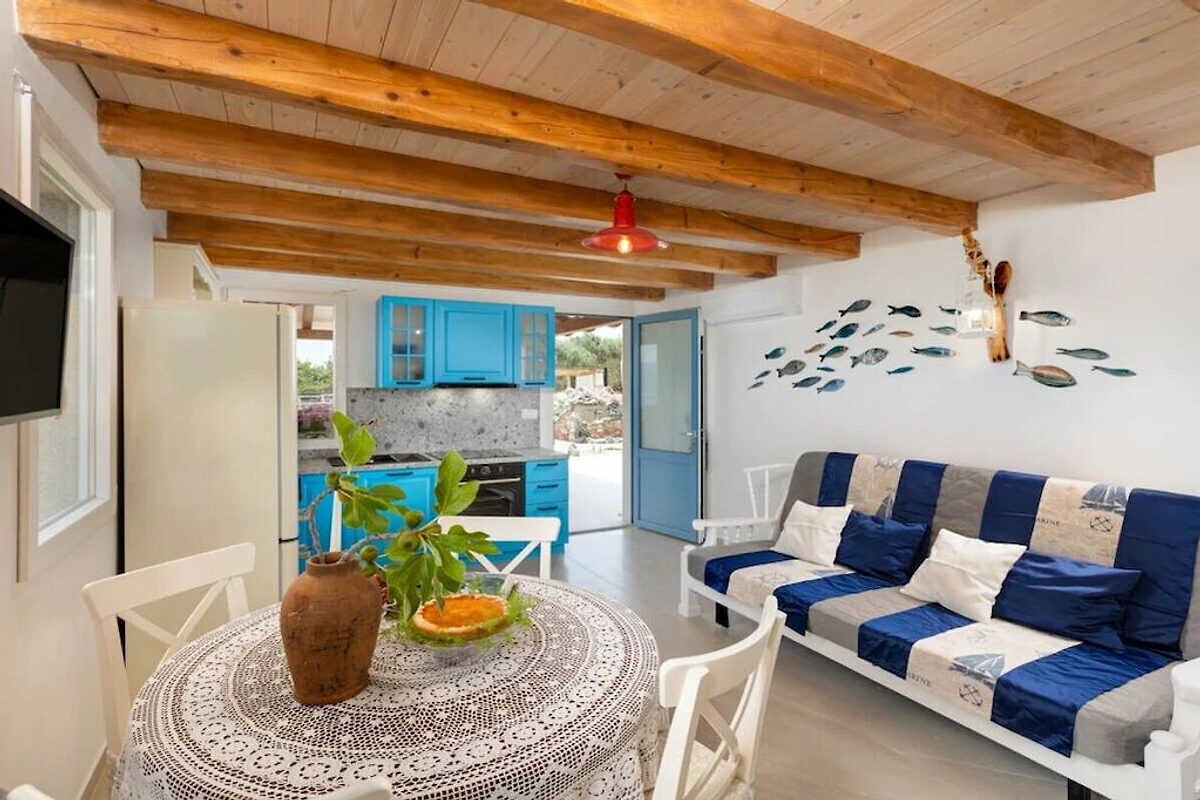 Die Villa Mare erstreckt sich über zwei Etagen und vereint Funktionalität mit Komfort. Im Erdgeschoss befindet sich ein Wohnzimmer mit Küche und Essbereich. Im Obergeschoss befindet sich ein Schlafzimmer für drei Personen mit einem Doppelbett und einem Einzelbett. Vom Schlafzimmer aus gelangt man in ein Badezimmer mit Dusche. Zusätzlich steht den Gästen eine separate Toilette im Garten zur Verfügung. Vom großzügigen Außenbereich mit einer Fläche von 5.000 m² bietet sich ein atemberaubender Blick auf das Meer. Den Gästen stehen ein Pool, Tischtennis, Fußballtore und ein Volleyballfeld zur Verfügung.