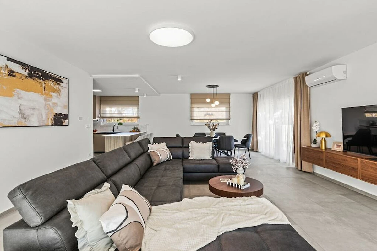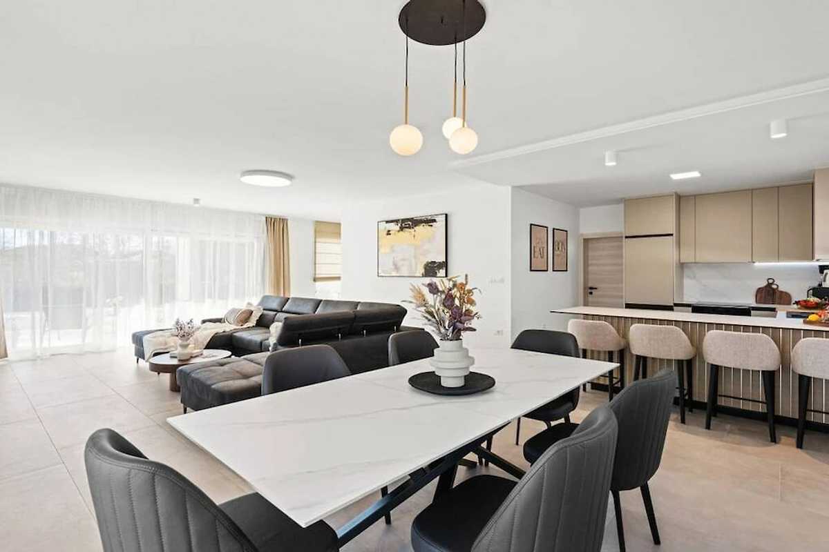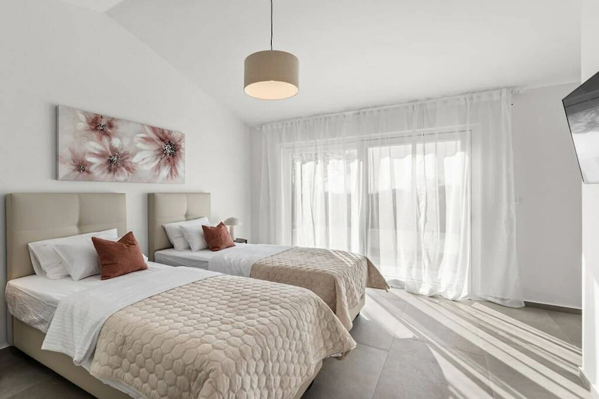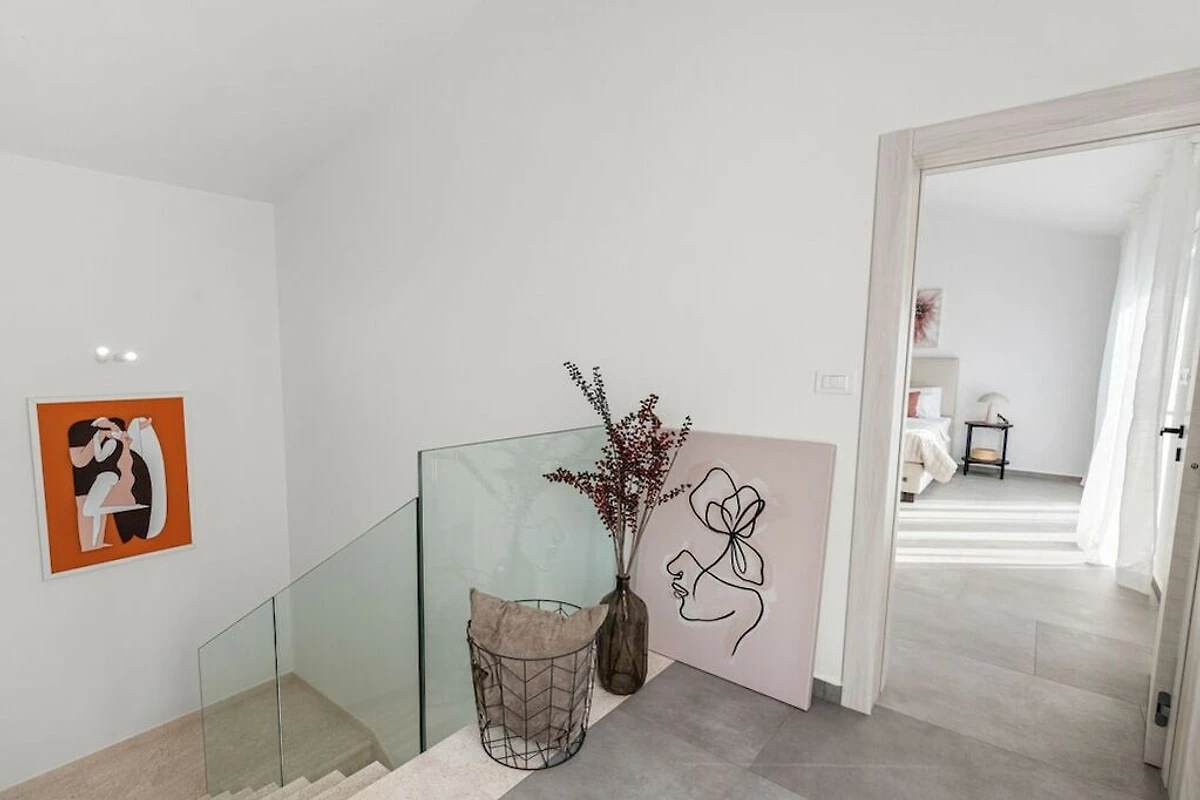 The villa is equipped with modern appliances and decorated in relaxing tones. It has 3 bedrooms with private bathrooms, a modern and fully equipped kitchen (toaster, microwave, cafeteria) with a dining table, a living room and toilet, and a laundry room. In the outdoor area there is a swimming pool, a covered terrace with a dining table and a barbecue for pleasant gatherings with family and friends. And another additional terrace perfect for enjoying the morning sun.