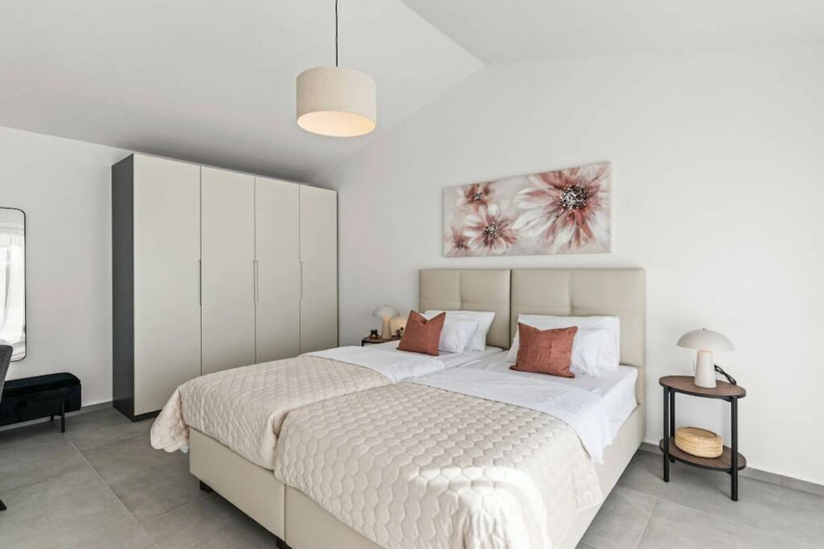 In der 1. Etage: (Diele(, Dusche, Waschbecken), Schlafzimmer(, , Einzelbett, Einzelbett, TV, TV, TV, Klimaanlage), Schlafzimmer(, , Doppelbett king size, Klimaanlage))