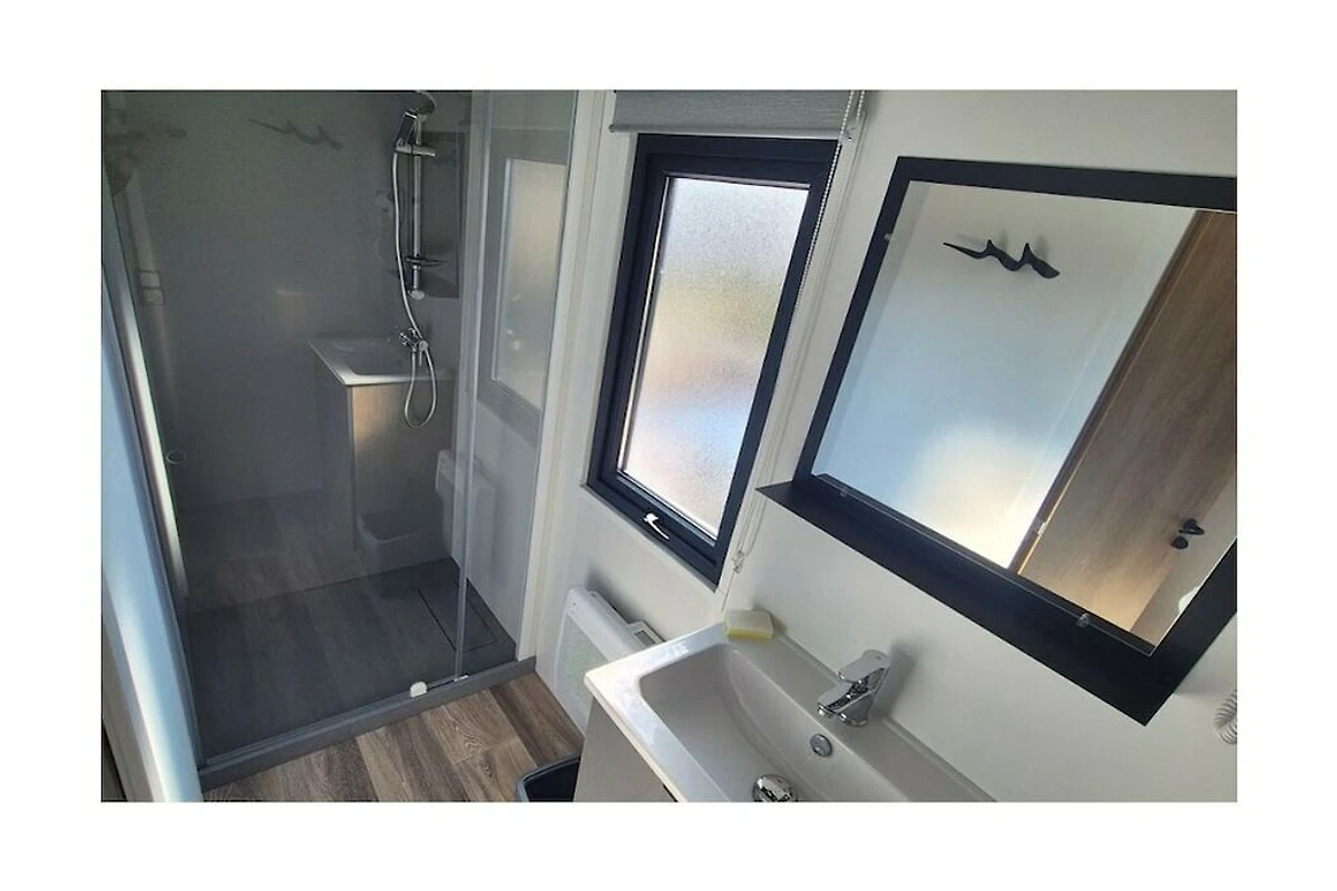 Im Badezimmer befindet sich eine Dusche und Waschbecken mit abstell Möglichkeiten und Fön. Das WC ist separat.