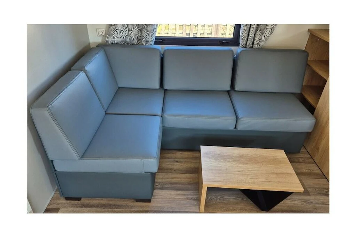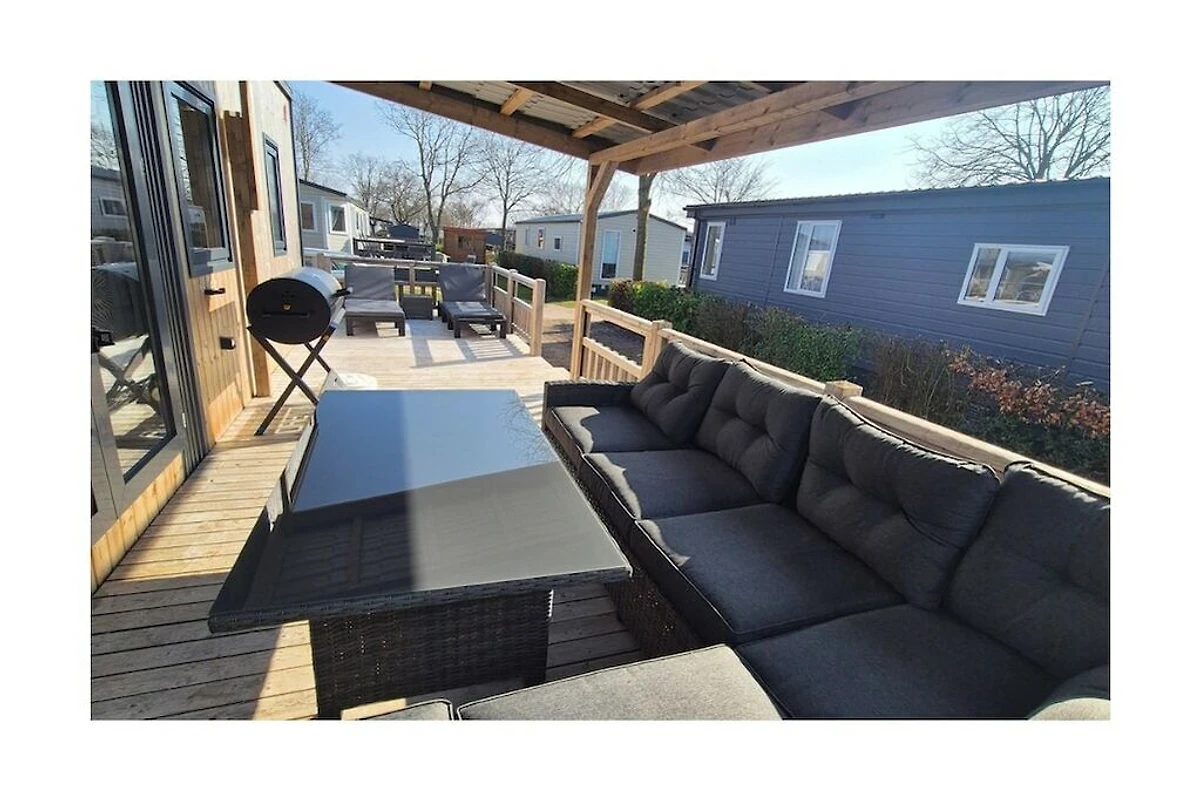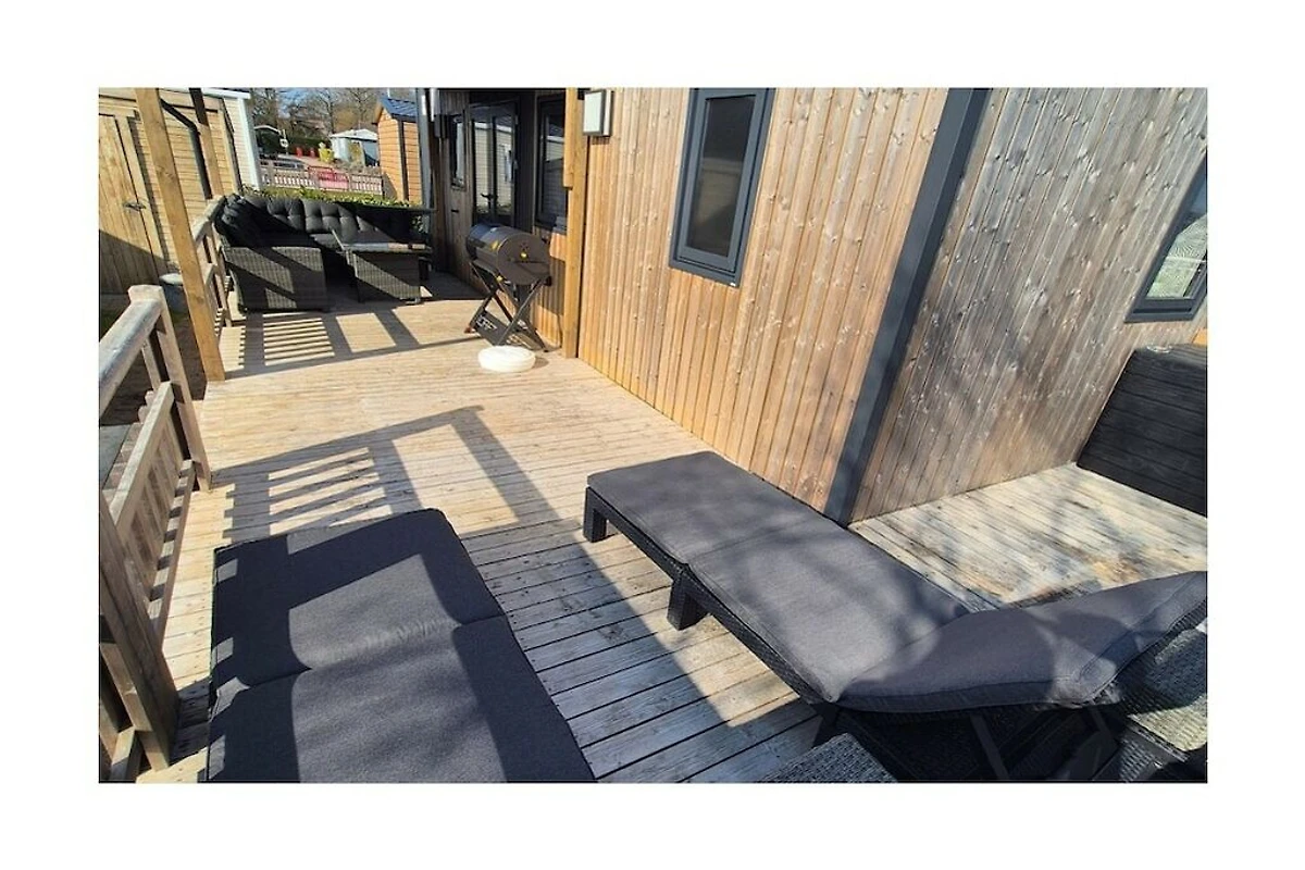 Im Wohnzimmer befindet sich eine Couch, ein Flat TV und einen Essbereich. Die offene Küche ist Standardmäßig eingerichtet. Dort befinden sich eine Spülmaschine, Backofen, Mikrowelle, Senseo Kaffeemaschine, Wasserkocher, Toaster und großer Kühlschrank . Direkt am Chalet befindet sich eine erhöhte Terrasse von 30 qm und ist mit einer gemütlichen Lounge Sitzecke, 2 Sonnenliegen und Grill ausgestattet.