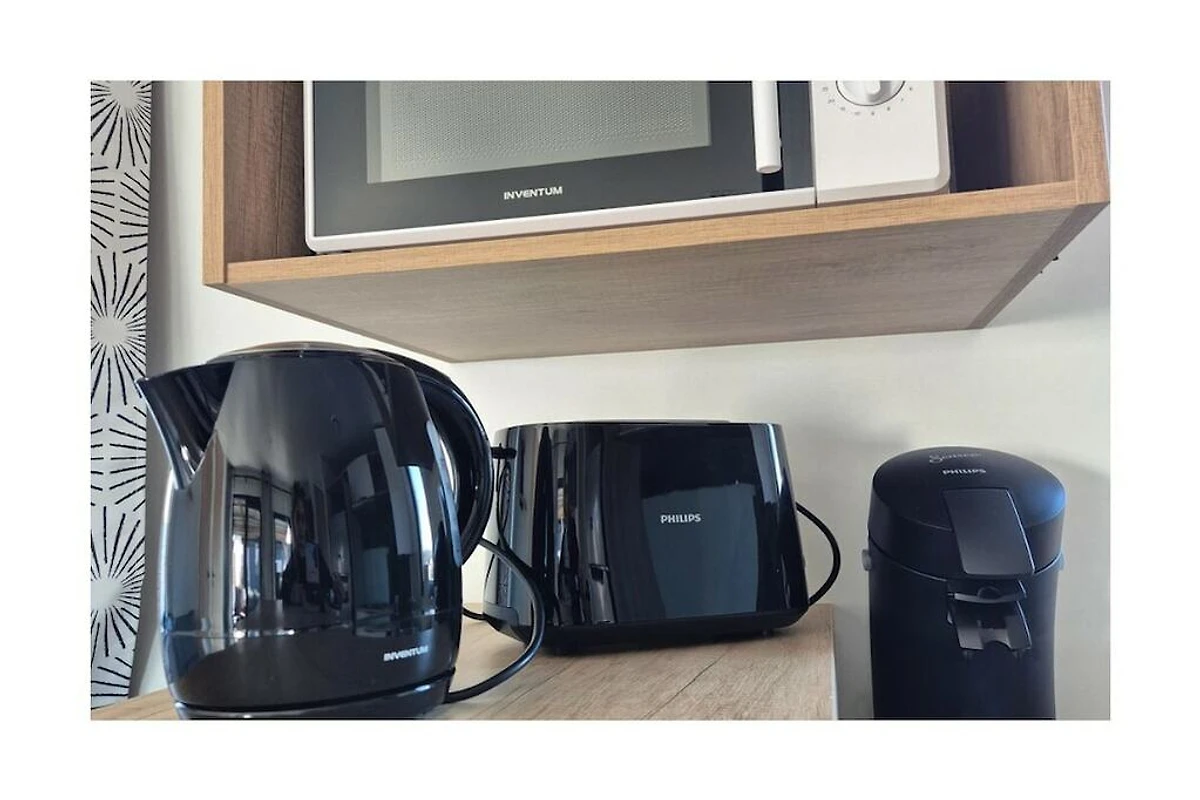 Parterre: (Esszimmer(TV, Esstisch), Küche(Kochnische, Herd, Herd, Wasserkocher, Toaster, Kochherd, Kaffeemaschine, Mikrowelle, Kühlschrank, Tiefkühlschrank), Badezimmer(, Dusche, Waschbecken), guest toilet(Toilette))