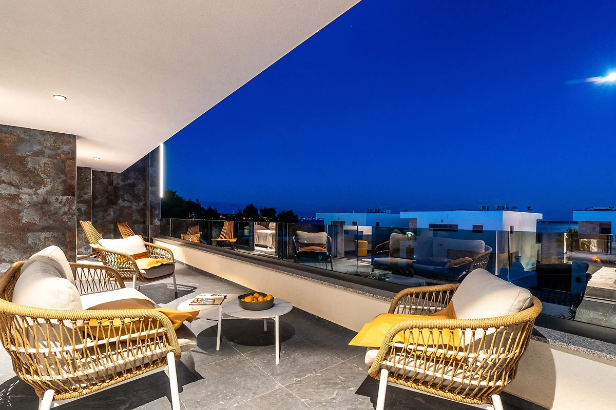 Der Aussenbereich ist ein wahres Highlight und bietet einen wunderschönen Garten, Gartenmöbel, einen Grillbereich und eine Terrasse. Mit 300 Quadratmetern Grundstück und 330 Quadratmetern Eigentum gibt es reichlich Platz zum Entspannen und Geniessen der atemberaubenden Meerblicke.