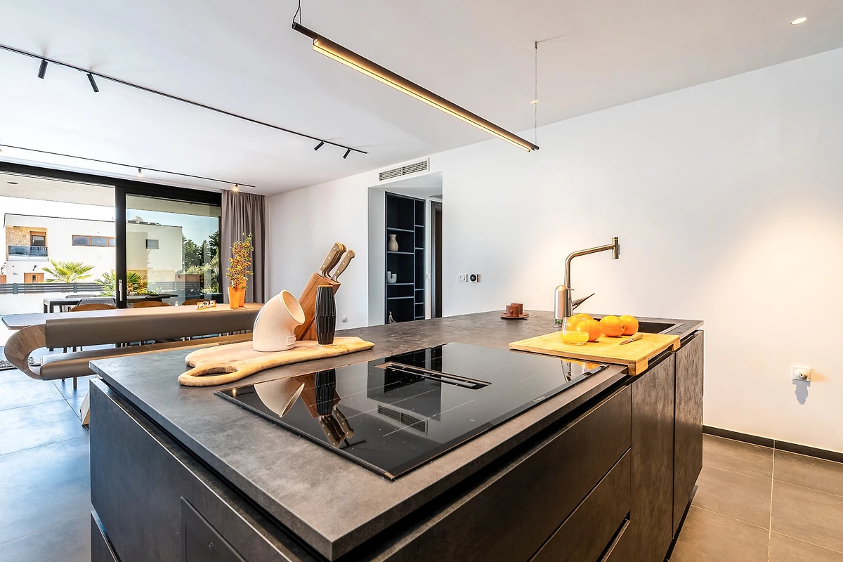 Das Herzstück des Hauses ist die voll ausgestattete amerikanische Küche mit hochwertigen Geräten, darunter ein Induktionskochfeld, Kühlschrank, Gefrierschrank, Backofen, Mikrowelle, Geschirrspüler, Kaffeemaschine sowie ein umfassendes Set an Küchenutensilien und Geschirr. Perfekt zum Zubereiten köstlicher Mahlzeiten und zum gemeinsamen Familienessen.