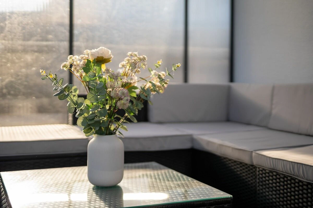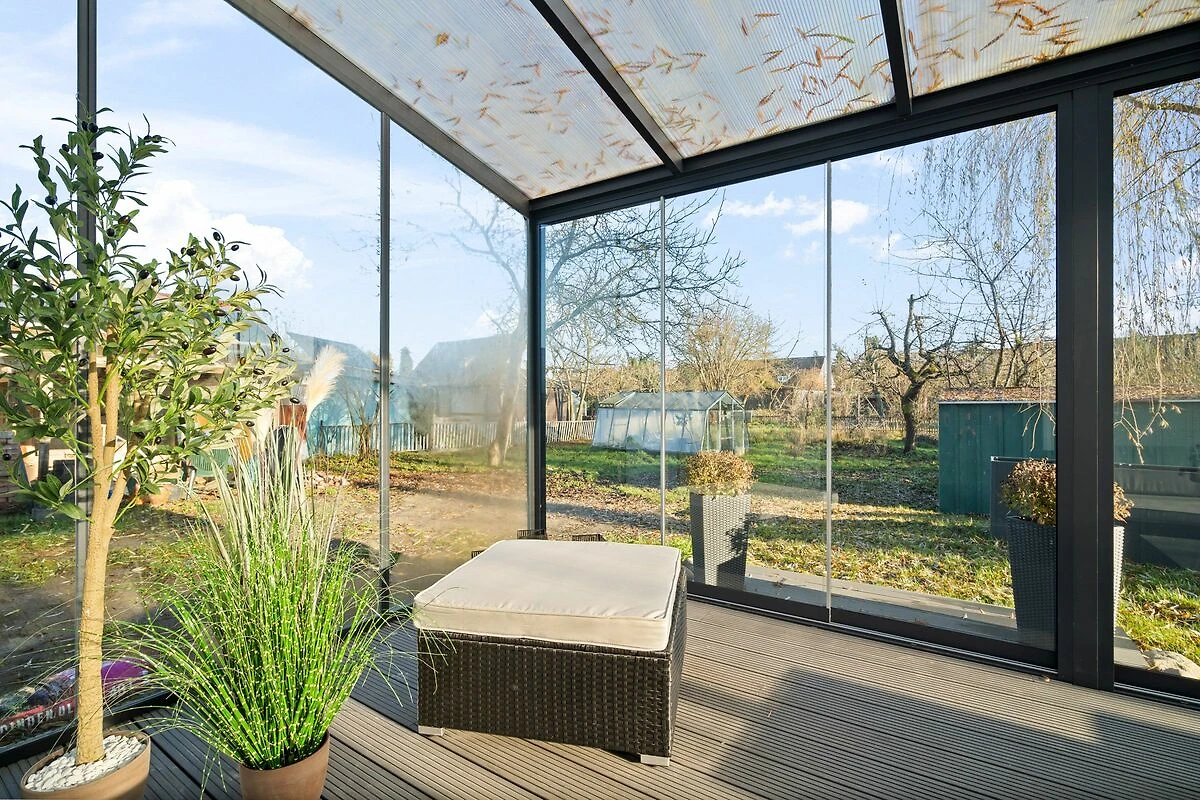 Ein besonderes Highlight ist der großzügige überdachte Wintergarten, der als Erweiterung des Wohnraums zu jeder Jahreszeit einen schönen Aufenthaltsort bietet. Direkt daran anschließende überdachte und geschlossene Terrasse mit Gartenmöbeln und Liegewiese ermöglicht entspannte Stunden im Grünen. Für Grillfreunde steht ein Kohlegrill zur Verfügung. Der Gartenblick und die ländliche Umgebung verleihen der Ferienwohnung ein einladendes Ambiente. Das Grundstück von rund 1.000 m² Fläche ist abgeschlossen und bietet viel Freiraum sowie Privatsphäre. Ihr Auto parken Sie bequem und kostenlos auf dem privaten Parkplatz der Unterkunft.