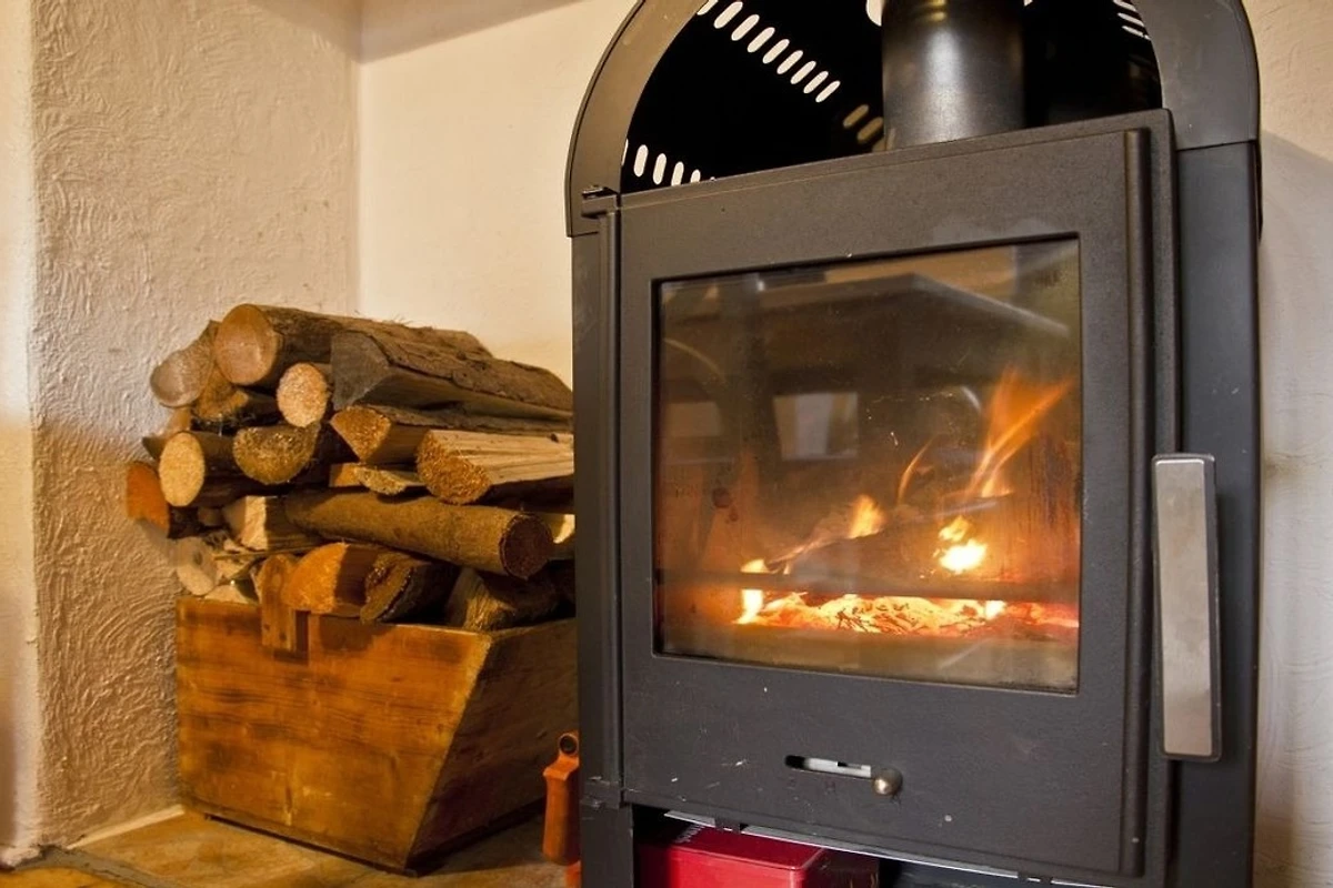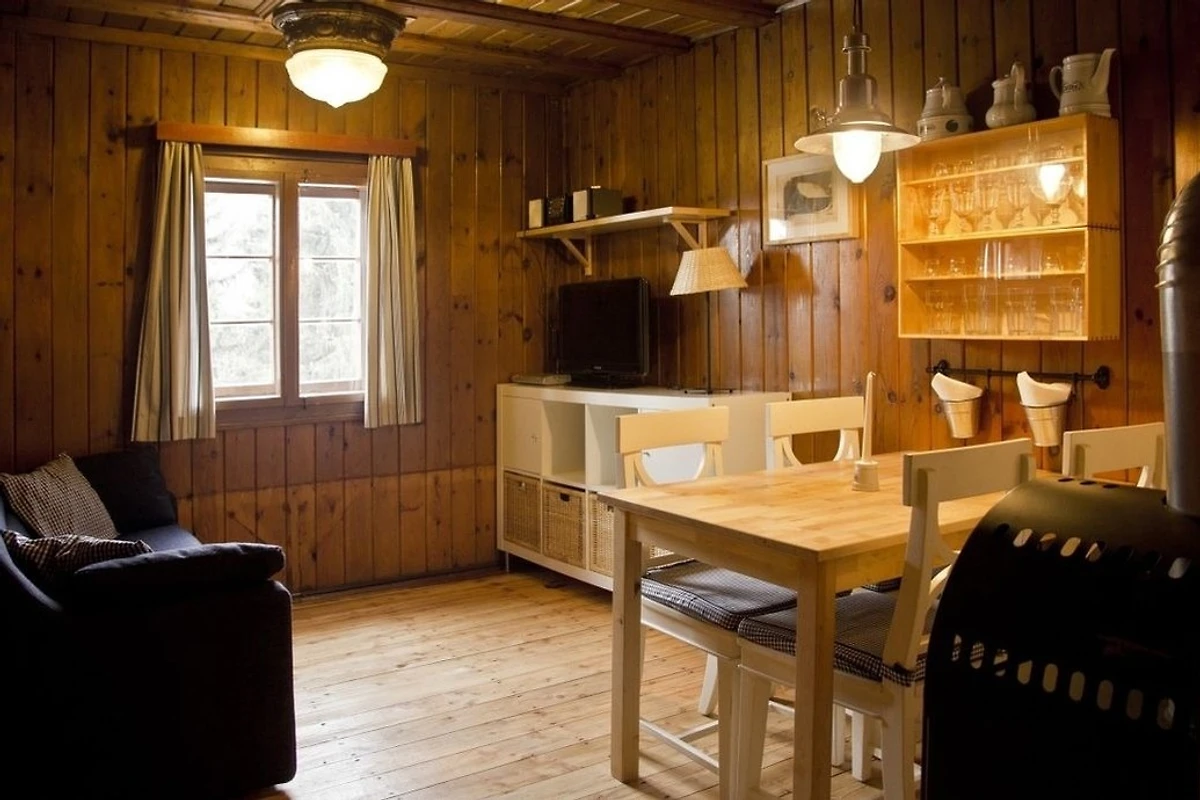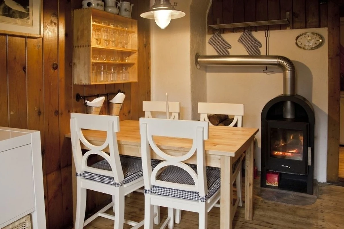 Der gemütliche Wohnraum mit Schwedenofen sorgt für wohlige Wärme und echtes Hüttenfeeling – besonders nach einem Tag auf der Piste ein Highlight.