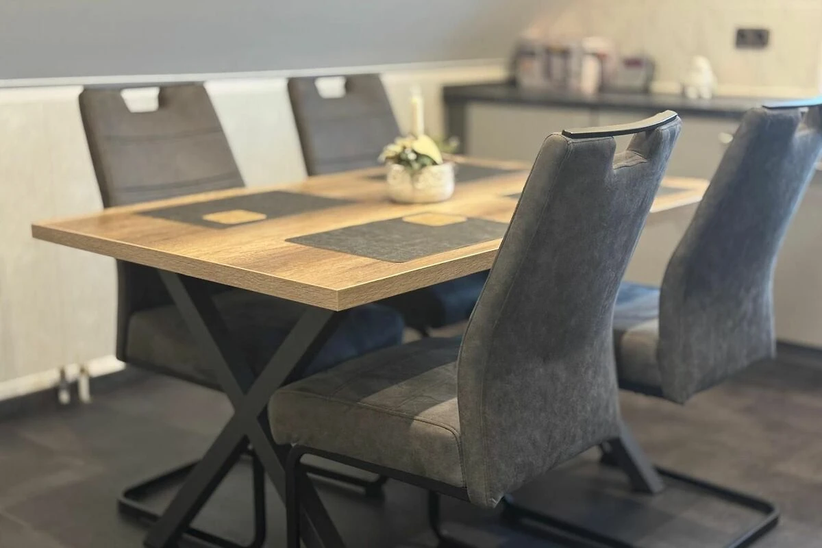 Der grosse Wohn- und Essbereich ist lichtdurchflutet und hochwertig ausgestattet. Eine komfortable Couch, ein moderner Fernseher und freundliche Holzmöbel schaffen eine warme Atmosphäre. Direkt am Fenster lädt der Blick ins Grüne zum Träumen ein. Am angrenzenden Essbereich finden bis zu vier Personen Platz – perfekt für gemeinsame Mahlzeiten, Spieleabende oder ein gemütliches Frühstück mit Aussicht.