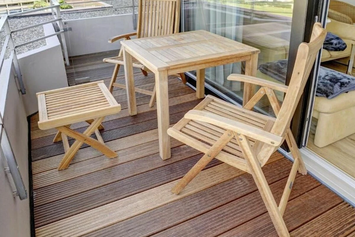 Der überdachte Balkon öffnet sich Richtung Meer und lädt mit seinem aussergewöhnlich guten Ausblick zum Erholen und Geniessen der frischen Ostseeluft ein.