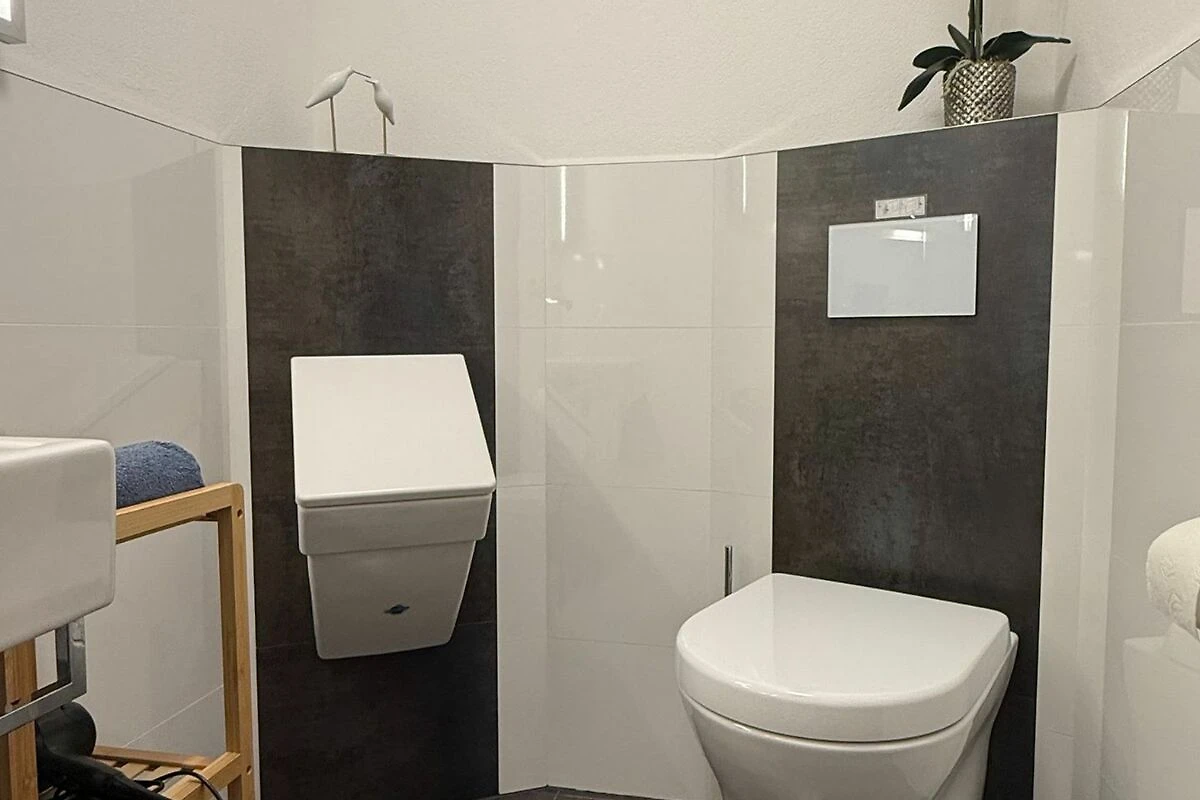 • Badezimmer: Der separate Sanitärbereich bietet Ihnen einen modernen Waschtisch mit berührungsloser Armatur, ein WC und ein Pissoir. Ein grosszügiger, beleuchteter Spiegel ergänzt das Badezimmer.