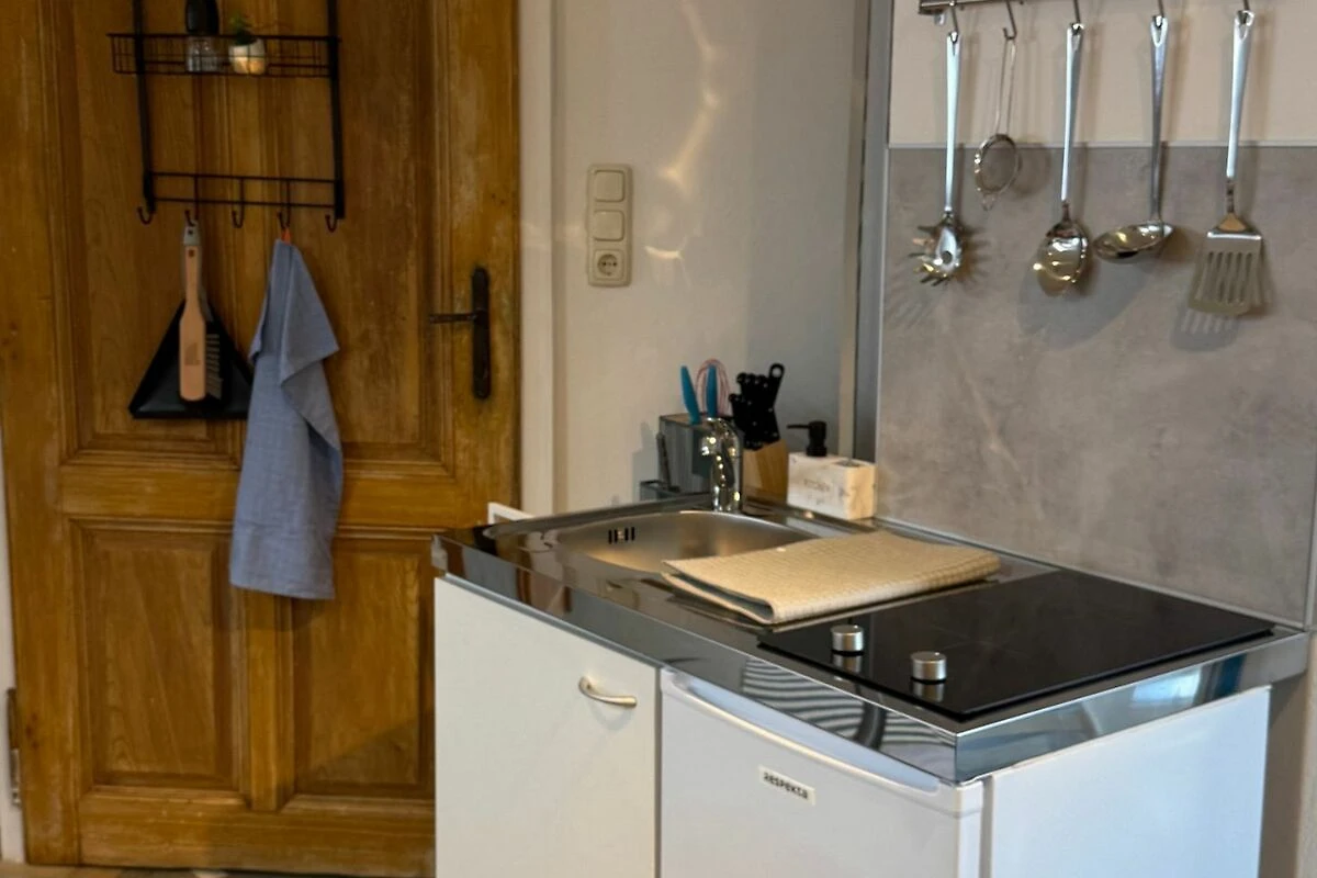 Kochnische: Ihre kleine Küchenzeile ist mit einer Spüle, zwei Cerankochfeldern und einem Kühlschrank mit Gefrierfach ausgestattet. Töpfe, Pfannen und Kochutensilien stehen bereit, um kulinarische Köstlichkeiten zu zaubern.