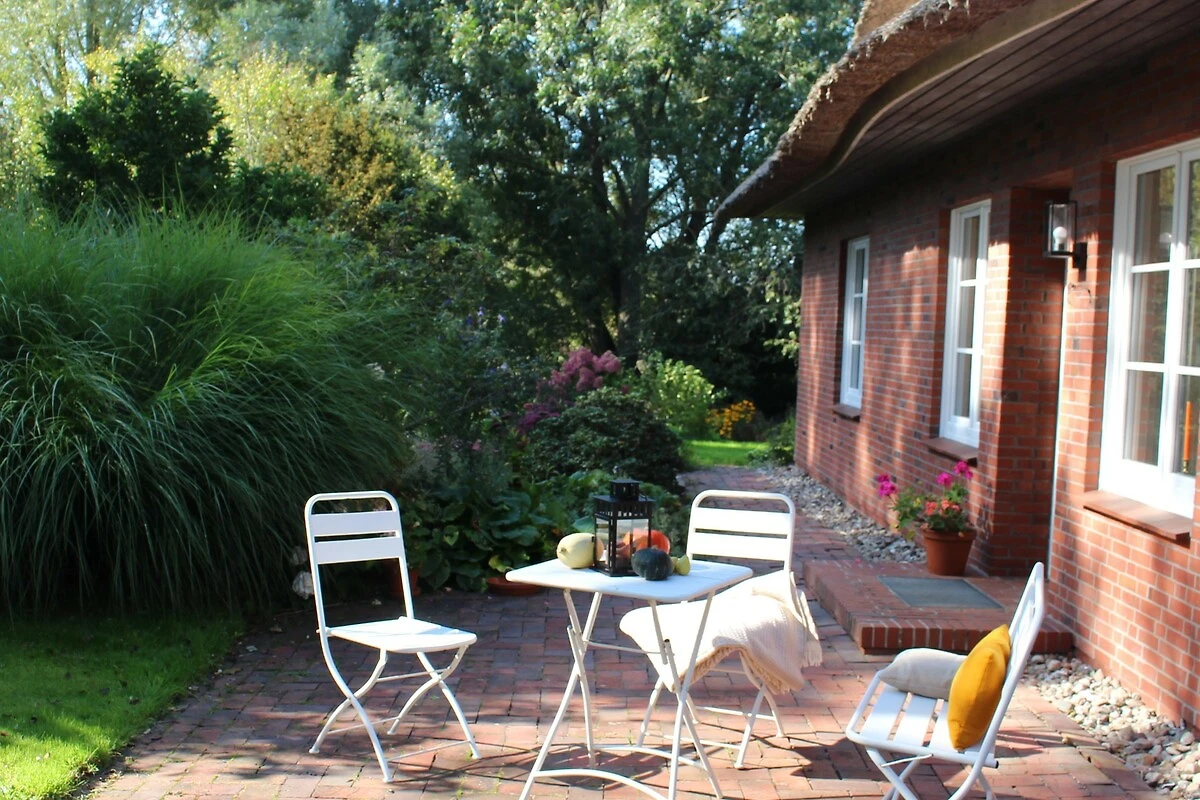 Backsteinterrasse mit Gartenmöbeln – perfekt für Frühstück oder Sundowner
