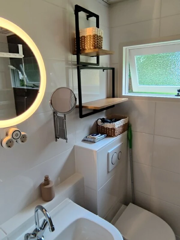 Das Chalet verfügt über ein separates Schlafzimmer, das mit frischer Bettwäsche für erholsame Nächte sorgt. Das moderne Badezimmer ist mit einer großzügigen Dusche, Waschbecken und WC ausgestattet – alles, was Sie für einen angenehmen Aufenthalt benötigen.