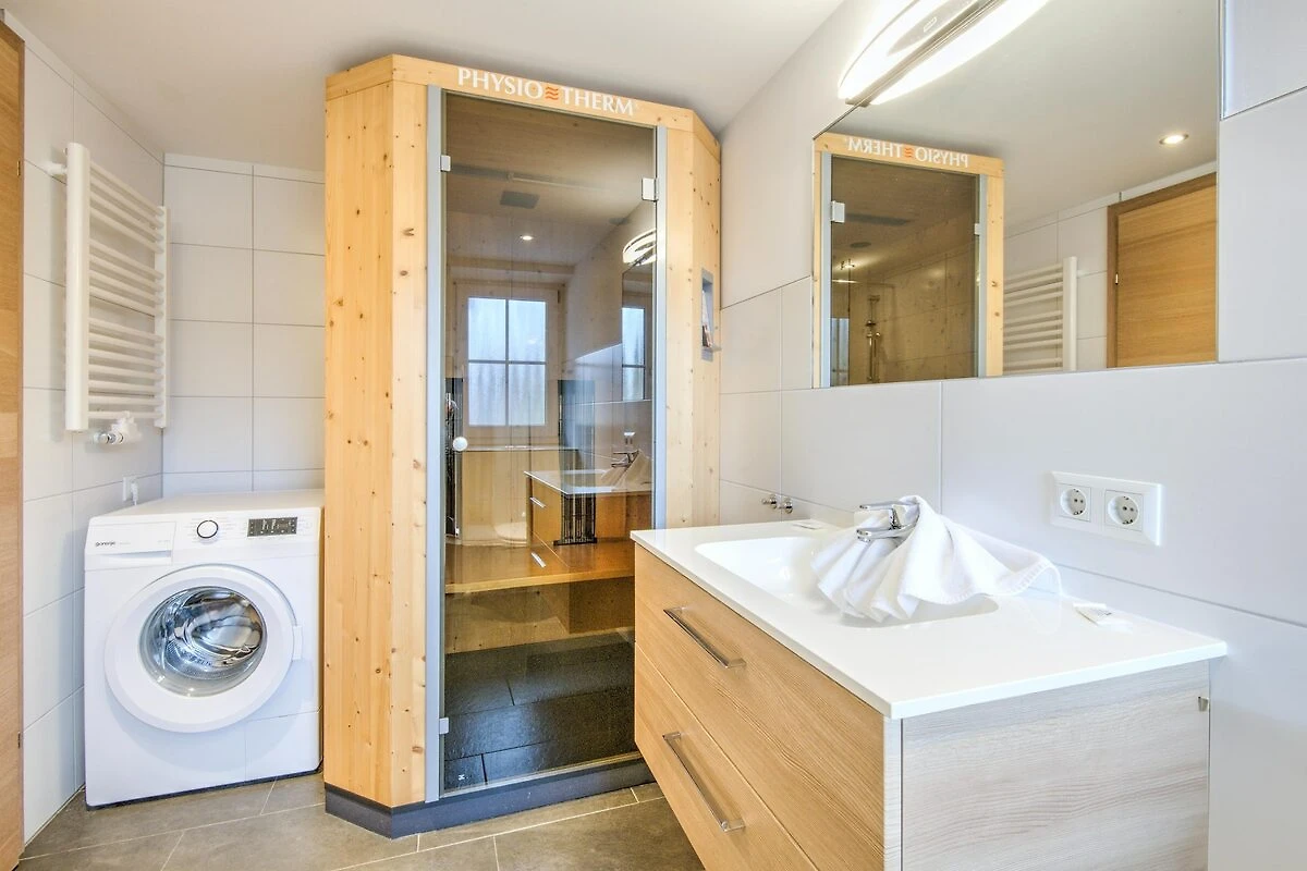 Offene Küche(Kochplatte(4 Kochplatten, Ceranfeld), Wasserkocher, Toaster, Kaffeemaschine(Filter), Backofen, Mikrowelle, Spülmaschine, Kühl-/Gefrierkombination), Wohn/Esszimmer(TV, DVD-Spieler, Stereoanlage), Schlafzimmer(Doppelbett), Schlafzimmer(Doppelbett), Badezimmer(Badewanne, Infrarotsauna, Toilette, Heizung(Fußbodenheizung)), Badezimmer(Dusche, Toilette), Freizeitraum(Gemeinschaftliche Nutzung mit anderen Gästen, auf dem Gelände)(Infrarotsauna(Gemeinschaftliche Nutzung mit anderen Gästen), Sauna(Gemeinschaftliche Nutzung mit anderen Gästen), Billard(Gemeinschaftliche Nutzung mit anderen Gästen)), Waschmaschine, Balkon, Parkplatz, Hochstuhl, Ladestation für Elektroautos, Babybett (kostenlos)
