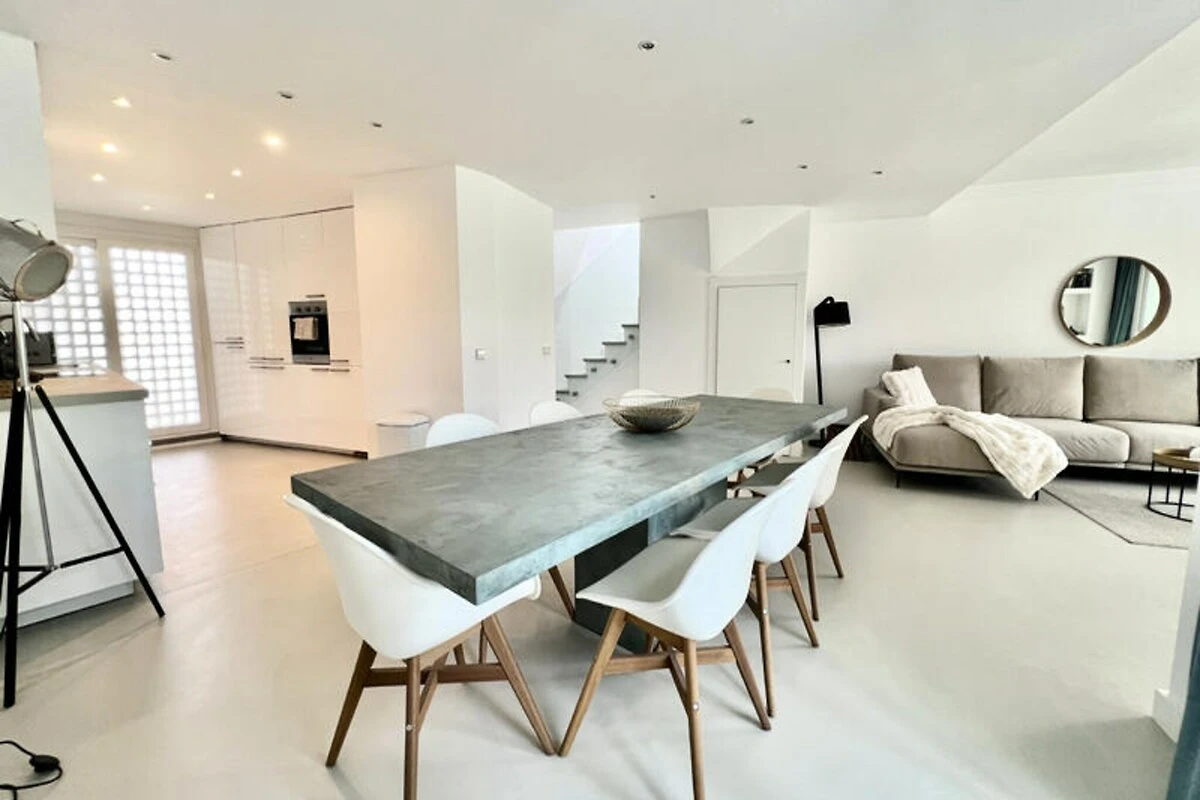 Das Stadthaus besticht durch sein modernes und stilvolles Design. Im Erdgeschoss befindet sich ein großzügiger Wohn- und Essbereich, der nahtlos in die voll ausgestattete Küche übergeht. Zwei Terrassen und ein privater Garten bieten viel Platz im Freien zum Essen unter freiem Himmel oder einfach zum Genießen des mediterranen Flairs. Im Obergeschoss sorgen drei Schlafzimmer und drei Badezimmer für Komfort und Privatsphäre für alle Gäste. Die Master-Suite ist ein besonderes Highlight: Sie verfügt über ein luxuriöses Badezimmer en suite, ein Ankleidezimmer und eine private Terrasse mit Blick auf die idyllischen Gärten.