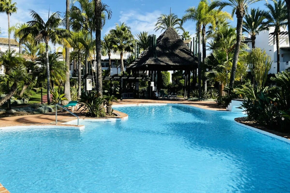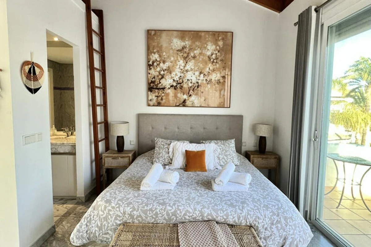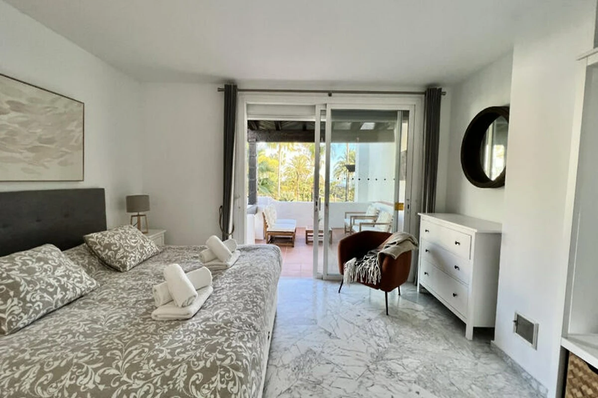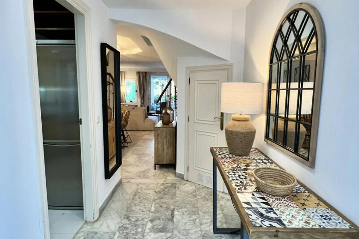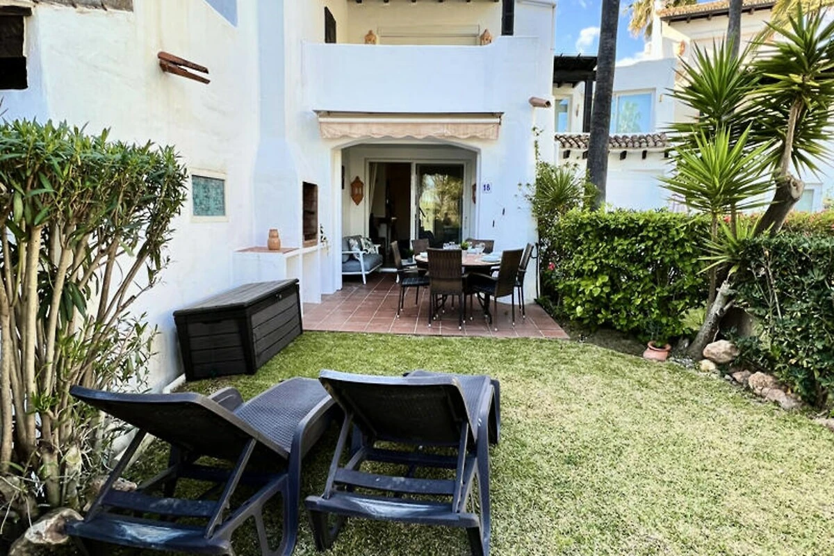 Nur wenige Schritte vom goldenen Sandstrand der Costa del Sol entfernt, bietet dieses wunderschön renovierte Reihenhaus einen ruhigen Rückzugsort für Strandliebhaber und Sonnenanbeter. Stellen Sie sich vor, Sie wachen mit dem sanften Rauschen der Wellen auf, genießen Ihr Frühstück auf Ihrer privaten Terrasse mit atemberaubendem Meerblick und spazieren durch üppige tropische Gärten zum nur 30 Meter entfernten Strand. Dieses Anwesen vereint modernen Komfort mit einem Hauch von ethnischem Charme und schafft so den perfekten Rahmen für unvergessliche Momente mit Familie oder Freunden. \n\nIm Erdgeschoss empfängt Sie ein großzügiger Wohn- und Essbereich, der nahtlos in zwei Terrassen, einen Grillplatz und einen privaten Garten übergeht. Von hier aus haben Sie direkten Zugang zum Gemeinschaftspool und dem dahinterliegenden Strand. Die voll ausgestattete Küche öffnet sich zum Esszimmer und lädt zum gemeinsamen Kochen und Genießen ein. Im ersten Obergeschoss befinden sich zwei gemütliche Schlafzimmer, eines davon mit Terrasse und Meerblick, sowie zwei Badezimmer. Das absolute Highlight ist die Master-Suite im Dachgeschoss mit hohen Decken, einem eigenen Badezimmer und einer privaten Terrasse mit Panoramablick auf das Meer. Die Anlage bietet zahlreiche Annehmlichkeiten, darunter tropische Gärten, einen Kinderspielplatz und einen großen Swimmingpool mit Liegestühlen. Ob Sie am Pool entspannen oder die nahegelegene Küste erkunden möchten – dieses Haus ist der ideale Ausgangspunkt für Ihren Urlaub. Bitte beachten Sie, dass einer der Pools von November bis März geschlossen ist und regionale Wassersparmaßnahmen die Verfügbarkeit der Pools während Dürreperioden beeinträchtigen können. Mit seiner unschlagbaren Lage, der stilvollen Einrichtung und dem direkten Strandzugang ist dieses Anwesen ein wahres Juwel an der Costa del Sol. Ob Sie Ruhe oder Abenteuer suchen – dieses Haus lädt Sie ein, unvergessliche Erinnerungen an einem der malerischsten Orte Spaniens zu schaffen.