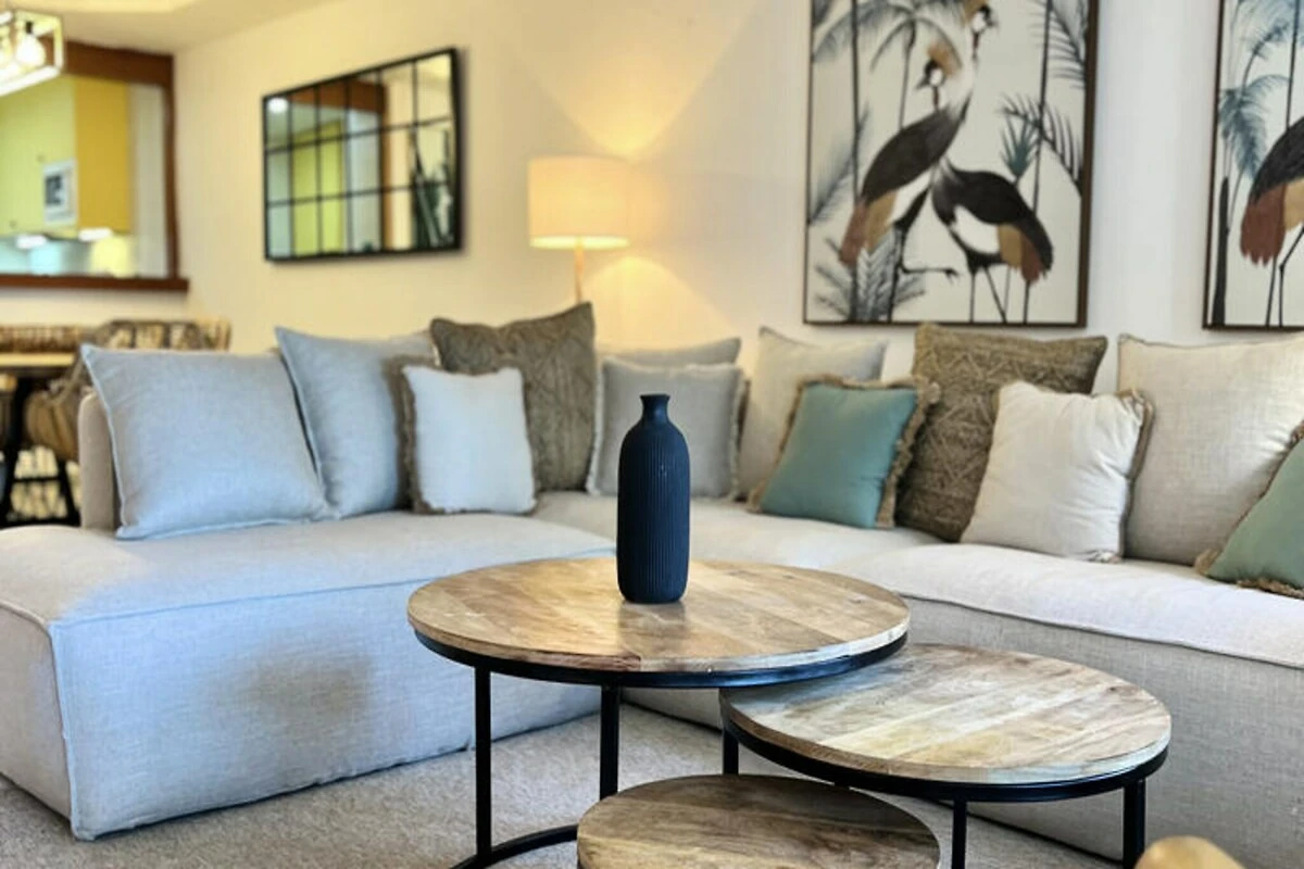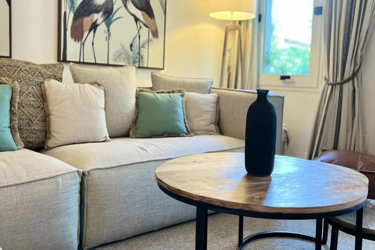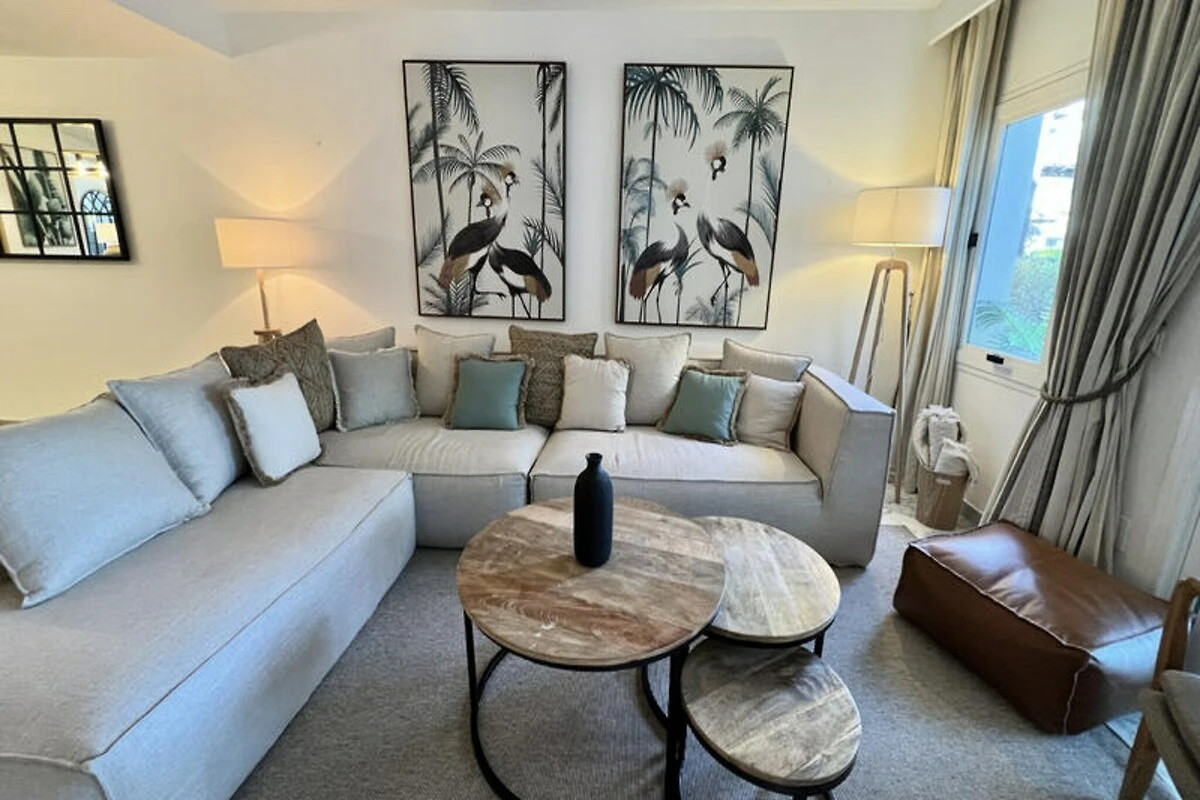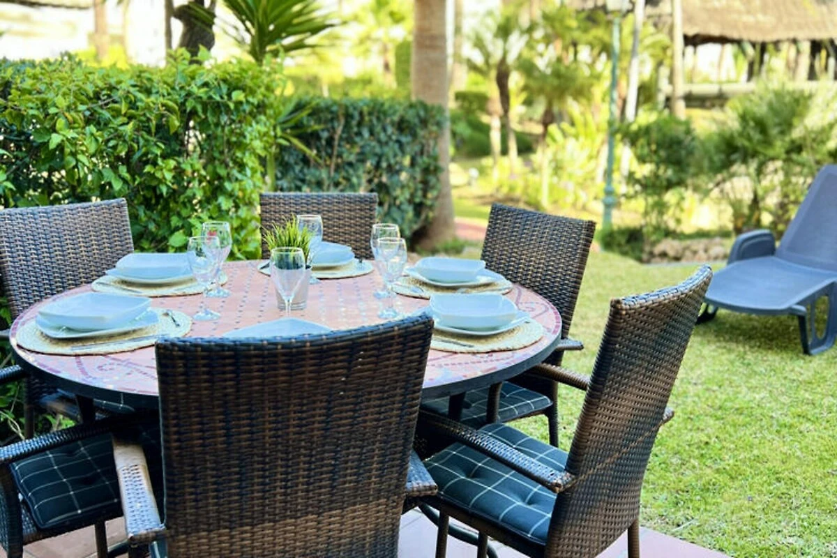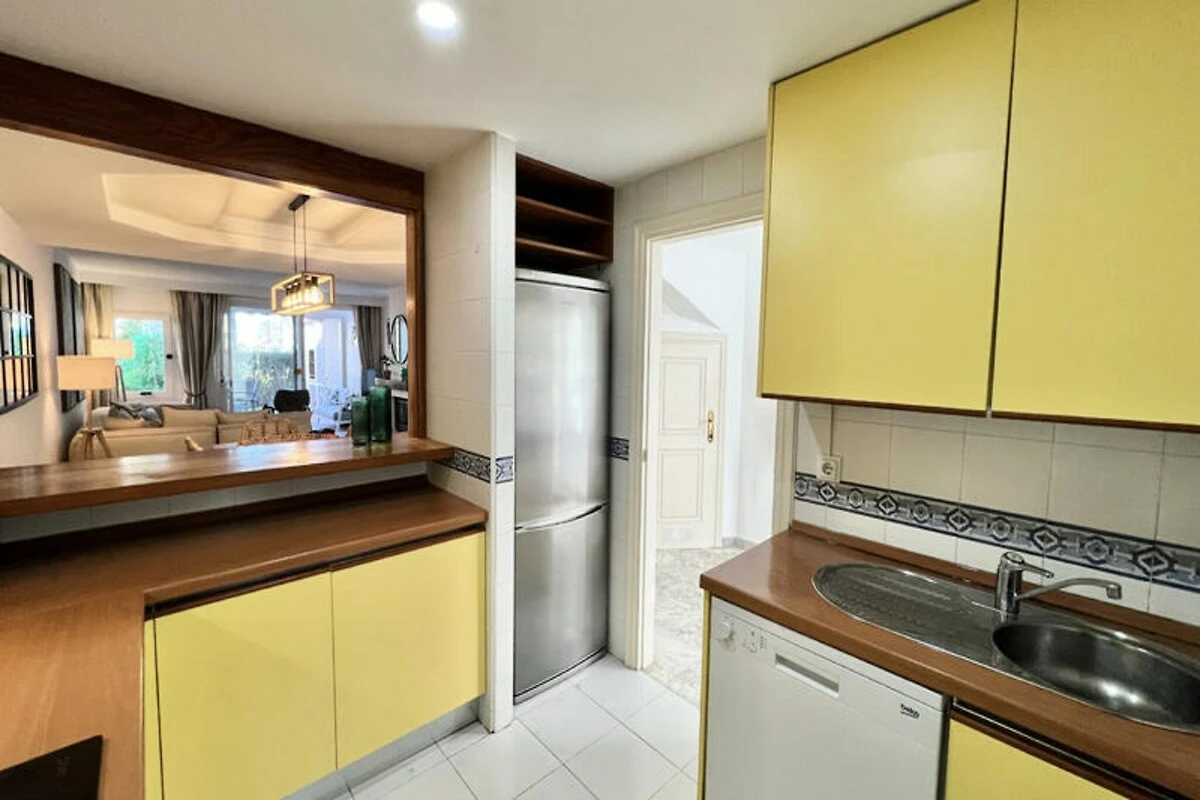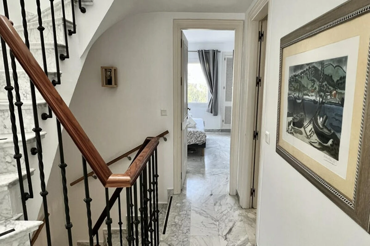 Nur wenige Schritte vom goldenen Sandstrand der Costa del Sol entfernt, bietet dieses wunderschön renovierte Reihenhaus einen ruhigen Rückzugsort für Strandliebhaber und Sonnenanbeter. Stellen Sie sich vor, Sie wachen mit dem sanften Rauschen der Wellen auf, genießen Ihr Frühstück auf Ihrer privaten Terrasse mit atemberaubendem Meerblick und spazieren durch üppige tropische Gärten zum nur 30 Meter entfernten Strand. Dieses Anwesen vereint modernen Komfort mit einem Hauch von ethnischem Charme und schafft so den perfekten Rahmen für unvergessliche Momente mit Familie oder Freunden. \n\nIm Erdgeschoss empfängt Sie ein großzügiger Wohn- und Essbereich, der nahtlos in zwei Terrassen, einen Grillplatz und einen privaten Garten übergeht. Von hier aus haben Sie direkten Zugang zum Gemeinschaftspool und dem dahinterliegenden Strand. Die voll ausgestattete Küche öffnet sich zum Esszimmer und lädt zum gemeinsamen Kochen und Genießen ein. Im ersten Obergeschoss befinden sich zwei gemütliche Schlafzimmer, eines davon mit Terrasse und Meerblick, sowie zwei Badezimmer. Das absolute Highlight ist die Master-Suite im Dachgeschoss mit hohen Decken, einem eigenen Badezimmer und einer privaten Terrasse mit Panoramablick auf das Meer. Die Anlage bietet zahlreiche Annehmlichkeiten, darunter tropische Gärten, einen Kinderspielplatz und einen großen Swimmingpool mit Liegestühlen. Ob Sie am Pool entspannen oder die nahegelegene Küste erkunden möchten – dieses Haus ist der ideale Ausgangspunkt für Ihren Urlaub. Bitte beachten Sie, dass einer der Pools von November bis März geschlossen ist und regionale Wassersparmaßnahmen die Verfügbarkeit der Pools während Dürreperioden beeinträchtigen können. Mit seiner unschlagbaren Lage, der stilvollen Einrichtung und dem direkten Strandzugang ist dieses Anwesen ein wahres Juwel an der Costa del Sol. Ob Sie Ruhe oder Abenteuer suchen – dieses Haus lädt Sie ein, unvergessliche Erinnerungen an einem der malerischsten Orte Spaniens zu schaffen.