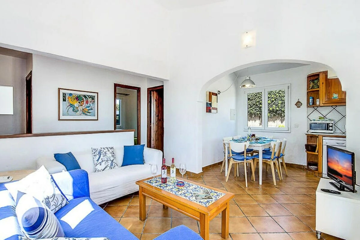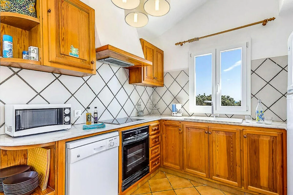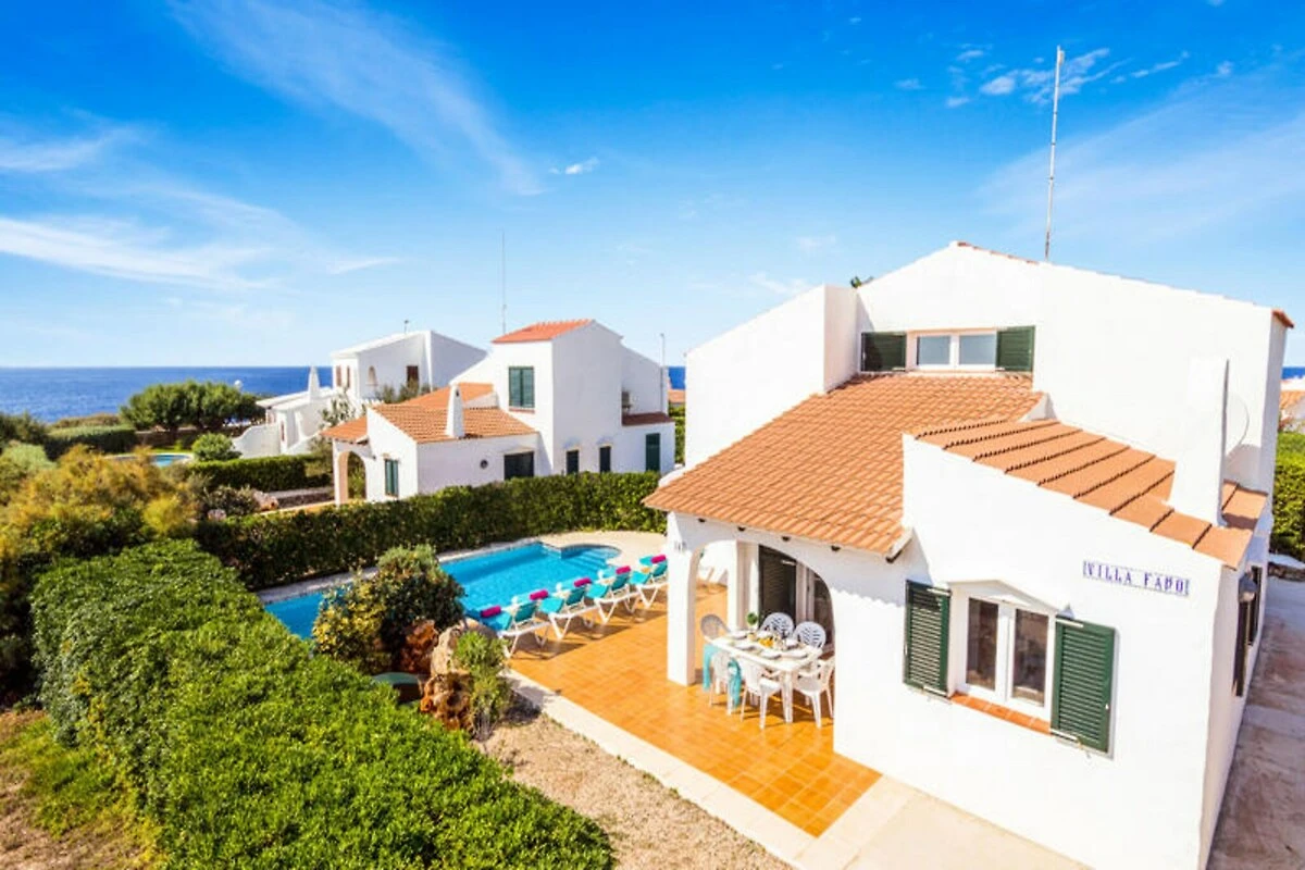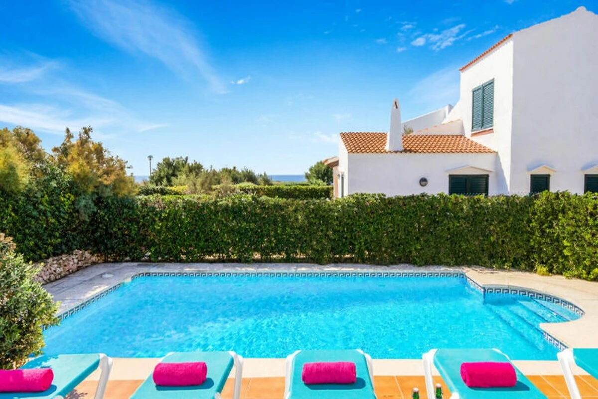 An der sonnenverwöhnten Küste von Cap d'Artruix bietet diese charmante Villa einen ruhigen Rückzugsort mit atemberaubendem Meerblick und entspannter Atmosphäre. Perfekt für Familien oder Gruppen bis zu sechs Personen, ist dieses helle und einladende 90 m² große Refugium eine Oase der Ruhe und des Küstenlebens. Nur wenige Schritte vom glitzernden Wasser des Strandes Calan Bosch entfernt, ist es ein idealer Ausgangspunkt, um die natürliche Schönheit und die lebendige Kultur Menorcas zu entdecken. \n\nTreten Sie ein und entdecken Sie einen liebevoll eingerichteten Raum mit drei komfortablen Schlafzimmern, einem geräumigen Wohnbereich und einer voll ausgestatteten Küche im amerikanischen Stil mit modernen Annehmlichkeiten wie Cerankochfeld, Geschirrspüler und Kaffeemaschine. Die luftigen Innenräume der Villa werden durch einen privaten Garten, eine sonnige Terrasse und einen erfrischenden privaten Pool ergänzt, der sich perfekt zum Abkühlen an warmen mediterranen Nachmittagen eignet. Zu den weiteren Annehmlichkeiten gehören Klimaanlage, WLAN, Sat-TV und eine Waschmaschine, die einen reibungslosen und angenehmen Aufenthalt gewährleisten.\n\nAuch außerhalb der Villa bietet die Umgebung zahlreiche Attraktionen. Die Sandstrände von Playa Calan Bosch sind nur 1 km entfernt, und das charmante Städtchen Ciutadella mit seinen historischen Gassen und seiner lebendigen Atmosphäre erreichen Sie nach nur 7 km. Golfliebhaber können eine Runde im renommierten Club de Golf Son Parc (24 km entfernt) spielen, und der Flughafen Mahón ist nur 35 km von der Unterkunft entfernt. Supermärkte, Restaurants und eine Bushaltestelle sind bequem zu Fuß erreichbar, sodass Sie die Schätze der Insel ganz einfach entdecken können.\n\nOb Sie am Pool die Sonne genießen, im Garten grillen oder Menorcas atemberaubende Küste erkunden – diese Villa verspricht einen unvergesslichen Mittelmeerurlaub.