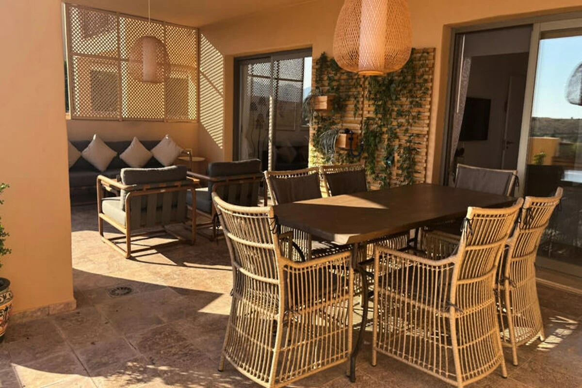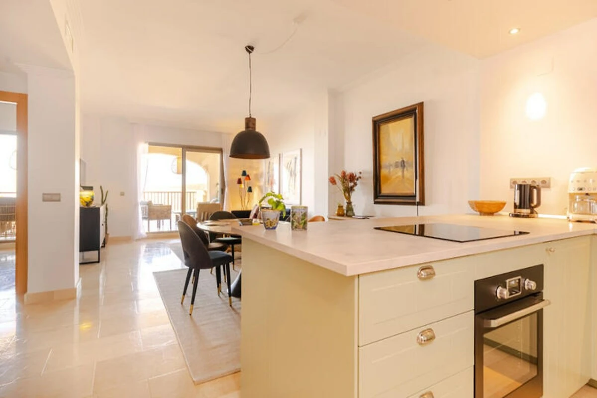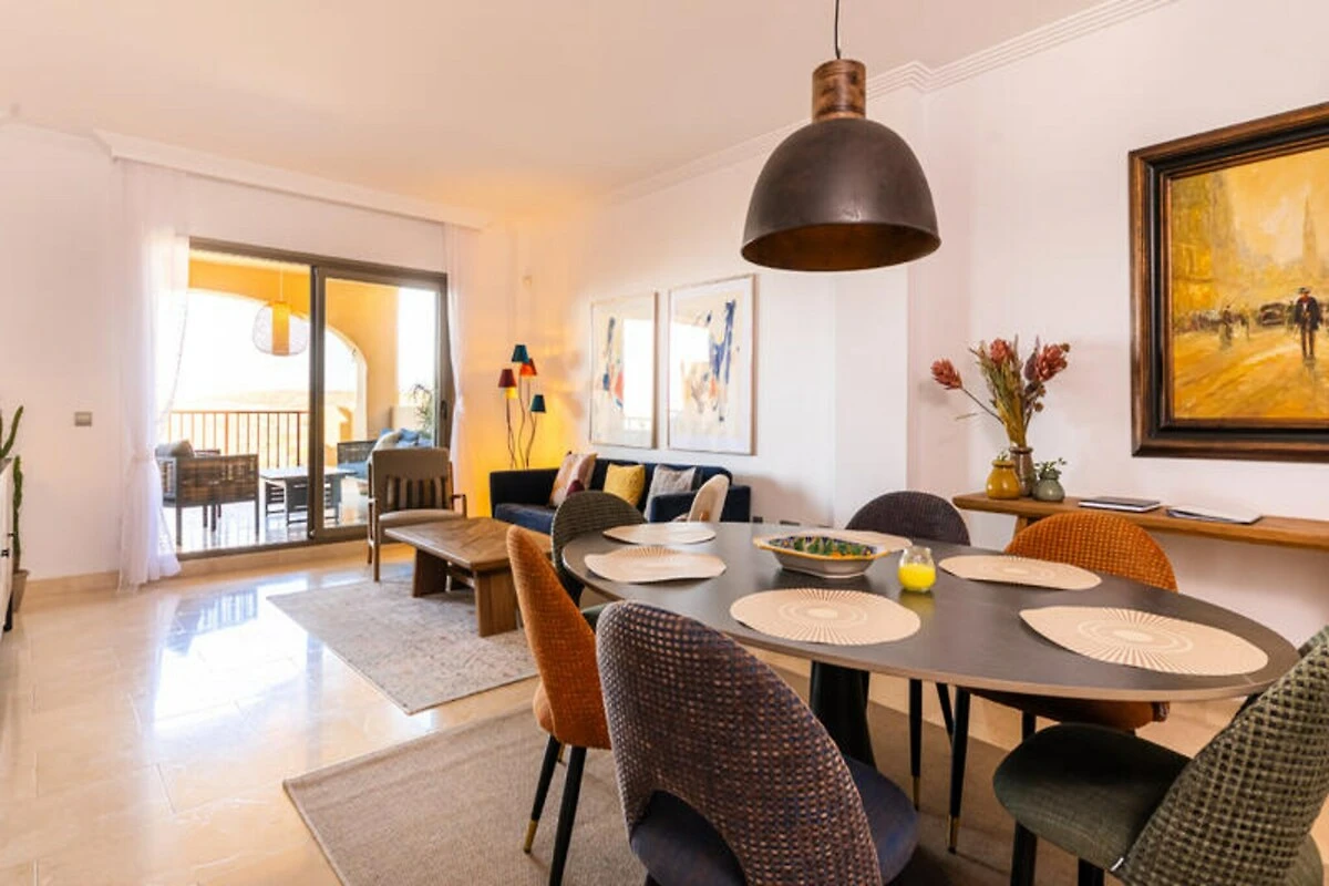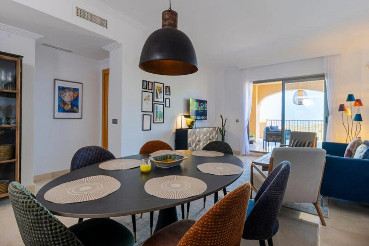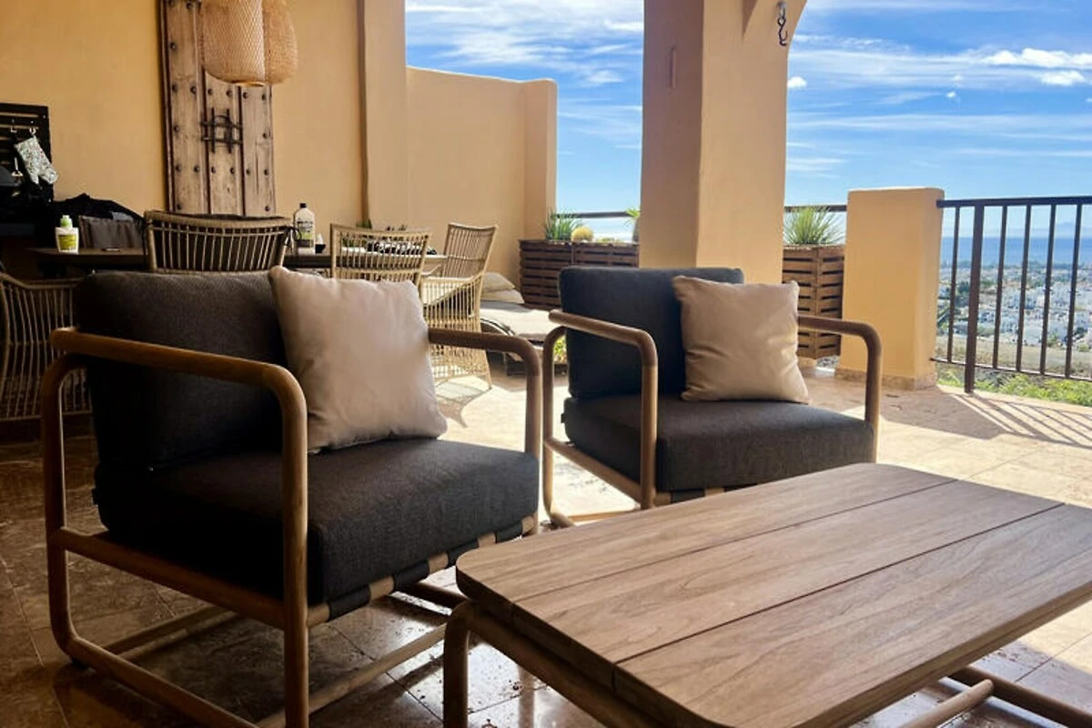 Hoch über der Costa del Sol, wo die Berge auf das Meer treffen, bietet dieses ruhige 3-Zimmer-Apartment in La Hacienda del Senorio de Cifuentes einen erholsamen Rückzugsort mit atemberaubender Aussicht. In der Nähe des charmanten Dorfes Benahavis gelegen, vereint es die friedliche Abgeschiedenheit mit der Nähe zum pulsierenden Nachtleben von Puerto Banús, erstklassigen Golfplätzen und exquisiten Restaurants. Hier können Sie mit der sanften mediterranen Brise erwachen und den Tag mit einem Sonnenuntergang über den Hügeln von Ihrer nach Westen ausgerichteten Terrasse ausklingen lassen. Das Apartment wurde kürzlich im klaren skandinavischen Stil renoviert und verbindet modernen Komfort mit dezenter Eleganz. Der offene Wohn- und Essbereich lädt zum Entspannen und geselligen Beisammensein ein, während die voll ausgestattete Küche alles bietet, was Sie für selbstgekochte Mahlzeiten benötigen. Das Hauptschlafzimmer verfügt über ein luxuriöses Kingsize-Bett, ein Badezimmer en suite mit Doppelwaschbecken und direkten Zugang zu einer nach Osten ausgerichteten Terrasse. Das zweite Schlafzimmer bietet ein gemütliches Queensize-Bett, während das dritte Schlafzimmer mit seinem Etagenbett ideal für Kinder oder Teenager ist. Alle Zimmer sind mit Fußbodenheizung und Klimaanlage ausgestattet und garantieren so ganzjährigen Komfort.\n\nLa Hacienda ist eine geschlossene Wohnanlage, die zum Entspannen und Erholen einlädt. Die wunderschön angelegten Gärten bieten vier große Swimmingpools, darunter ein Infinity-Pool, der in den Wintermonaten beheizt wird. Ob Sie am Pool relaxen oder die nahegelegenen Berge erkunden – diese Unterkunft bietet den perfekten Rückzugsort.\n\nBenahavis, bekannt als die \