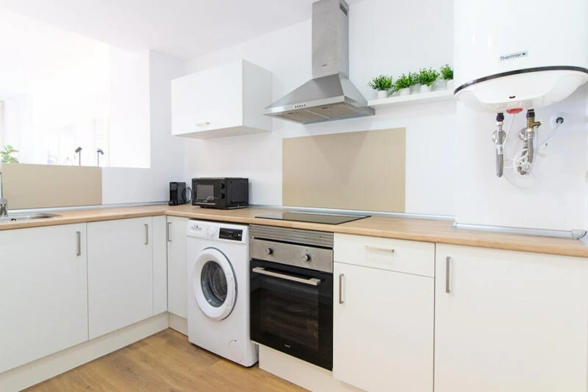 Das Apartment ist durchdacht gestaltet und bietet Platz für bis zu vier Gäste. Das helle und luftige Schlafzimmer sorgt für erholsame Nächte, während die offene Küche und der Wohnbereich zum Verweilen einladen. Die Küche ist komplett ausgestattet mit Cerankochfeld, Kühlschrank, Mikrowelle, Backofen und allem, was Sie zum Zubereiten köstlicher Mahlzeiten benötigen. Moderne Annehmlichkeiten wie WLAN, Klimaanlage und Wärmepumpe garantieren einen komfortablen Aufenthalt, während der Gemeinschaftspool zum Abkühlen und Entspannen unter der spanischen Sonne einlädt. Zur weiteren Ausstattung gehören eine Waschmaschine, ein Haartrockner und eine private Garage im Gebäude.