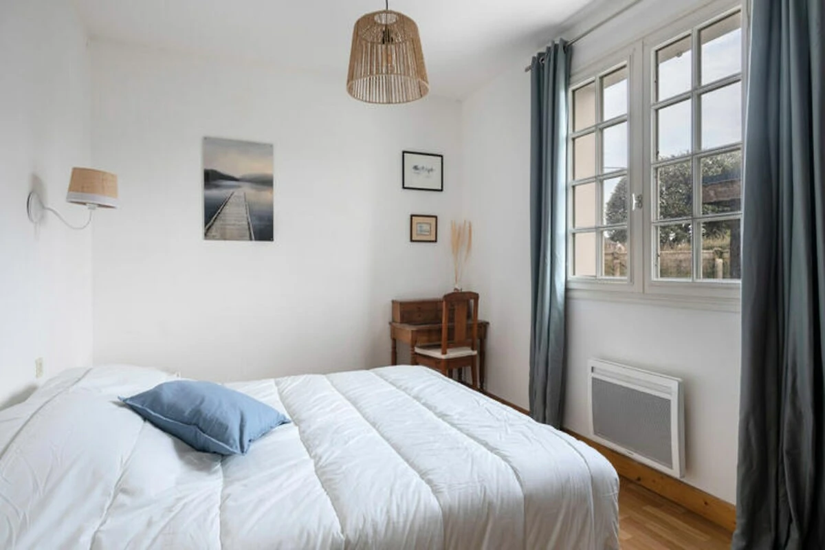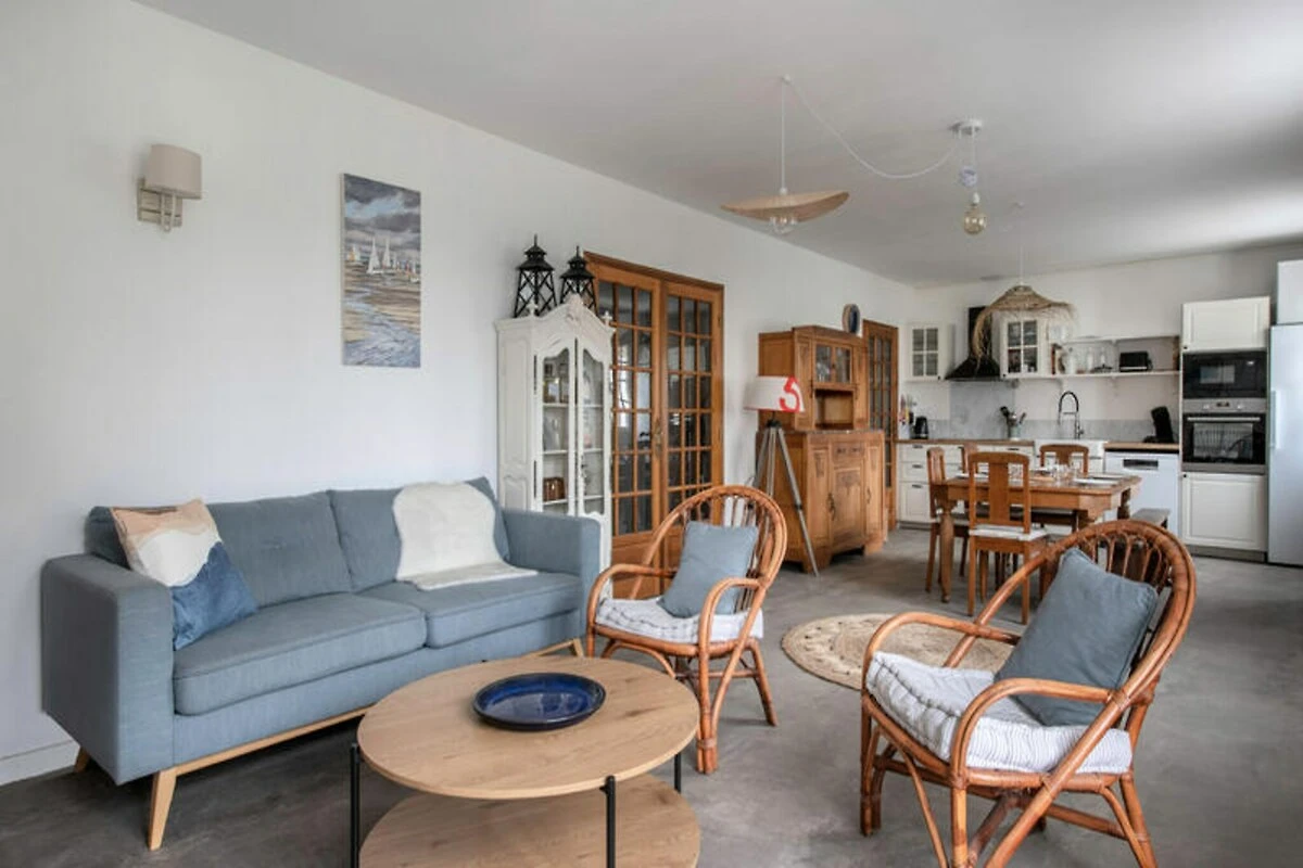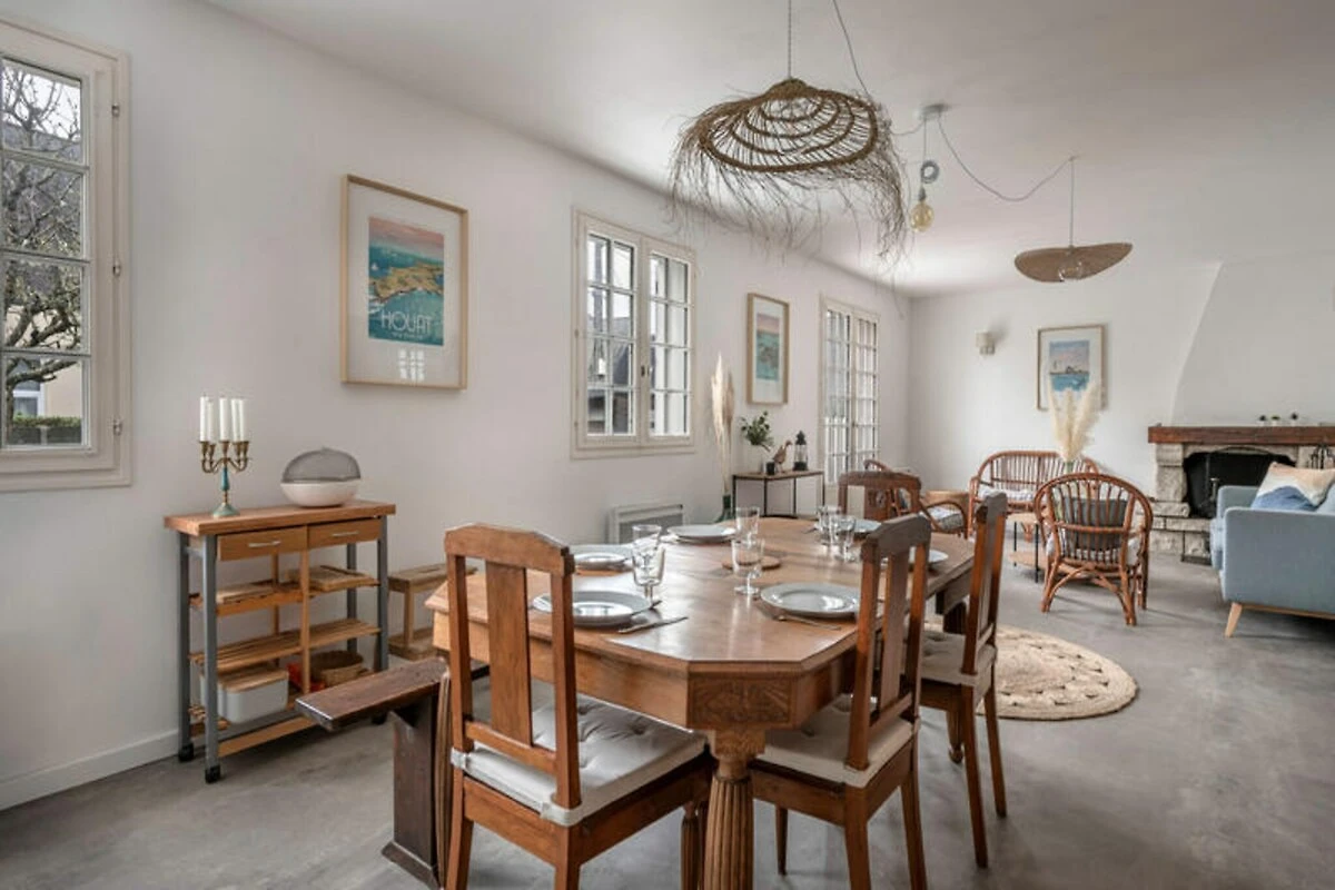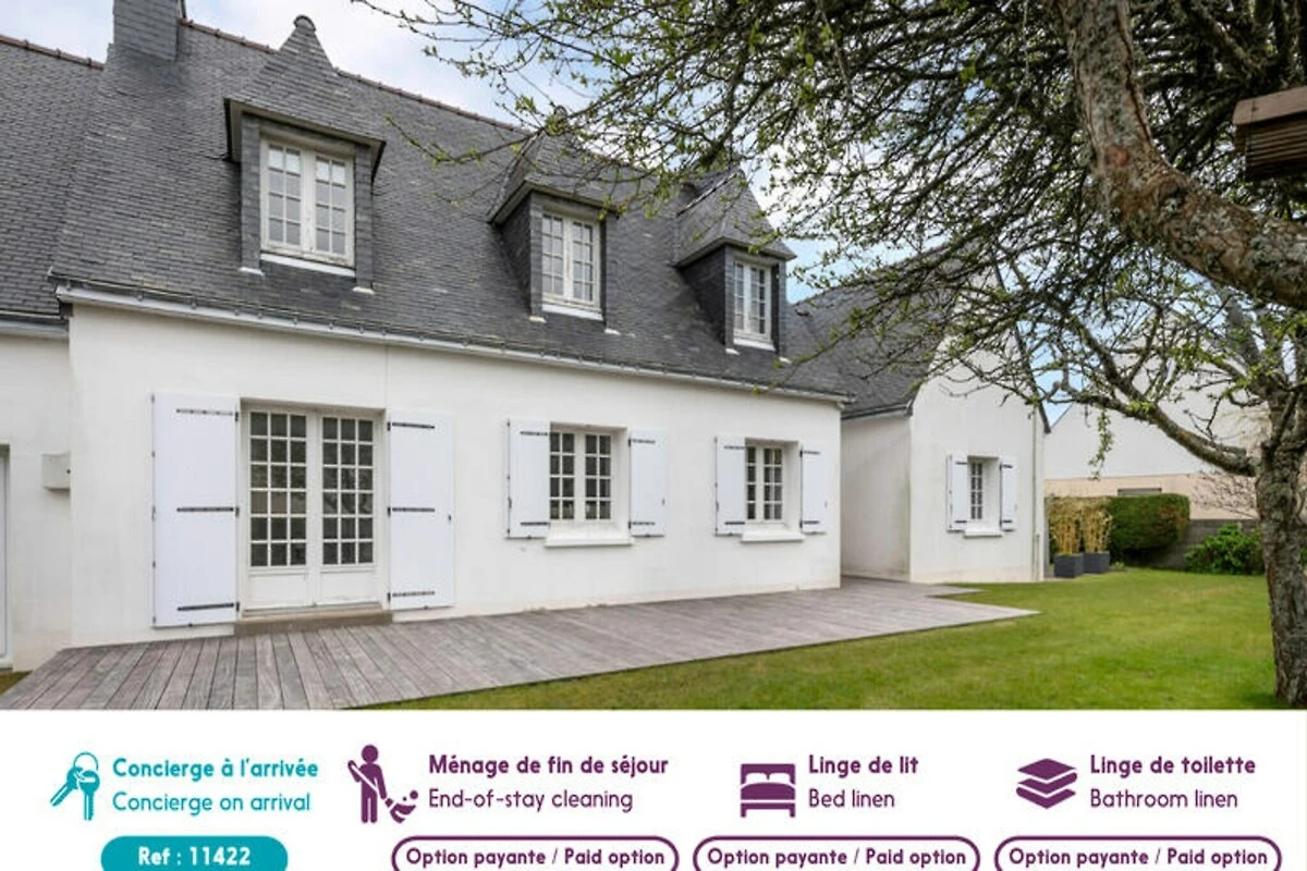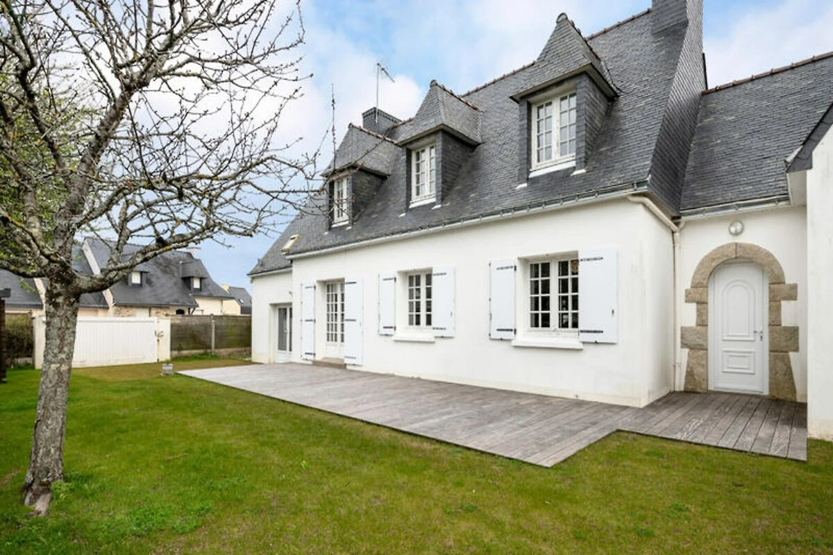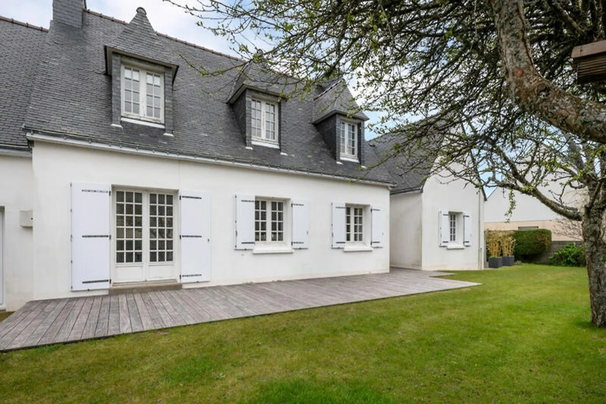 Stellen Sie sich vor, Sie wachen zum sanften Rauschen der Wellen und dem Duft der frischen Meeresluft auf, nur wenige Schritte vom Sandstrand von Saint Jacques entfernt. Dieses charmante 140 m² große Haus in Sarzeau bietet den perfekten Rückzugsort für Familien oder Freundesgruppen, die Entspannung und Abenteuer am Meer suchen. Mit Platz für bis zu 10 Gäste und der Möglichkeit, durch Anmietung des Nachbarhauses auf 15 Personen zu erweitern, ist dieses Anwesen ideal, um gemeinsam unvergessliche Erinnerungen zu schaffen. Ob Sie Ihr Frühstück im üppigen Garten genießen oder unter dem Sternenhimmel grillen – jeder Moment hier ist ein Fest der kleinen Freuden des Lebens. \n\nIm Inneren strahlt das Haus Wärme und Gemütlichkeit aus und verfügt über fünf liebevoll gestaltete Schlafzimmer. Zwei ruhige Zimmer im Erdgeschoss bieten große Doppelbetten und eine beruhigende weiß-blaue Einrichtung, während im Obergeschoss zwei weitere Doppelzimmer und ein fröhliches Kinderzimmer mit Etagenbett und Einzelbett für erholsame Nächte sorgen. Das geräumige Wohnzimmer lädt zum Entspannen bei einem Film oder angeregten Gesprächen ein, und die voll ausgestattete Küche macht das Zubereiten von Mahlzeiten zum Vergnügen. Moderne Annehmlichkeiten wie WLAN, eine Waschmaschine und ein Parkplatz sorgen für zusätzlichen Komfort während Ihres Aufenthalts. \n\nEntdecken Sie die Highlights von Sarzeau direkt vor der Tür. Der Strand Saint Jacques ist nur 400 Meter entfernt und lädt zum Sonnenbaden oder Muschelsammeln ein. In der Nähe befinden sich Restaurants wie Chti Billig und L’Endroit, die köstliche regionale Küche servieren. Der Supermarkt Carrefour Express mit allem Nötigen ist nur wenige Schritte entfernt. Unternehmen Sie einen Ausflug zum malerischen Strand Kercambre, dem Wasserpark AquaGolfe oder dem charmanten Städtchen Vannes. \n\nOb Sie Ruhe am Meer oder die lebendige Kultur der Region suchen – dieses Haus bietet Ihnen beides. Lassen Sie sich von der Schönheit der bretonischen Küste inspirieren und schaffen Sie unvergessliche Erinnerungen in diesem traumhaften Refugium.