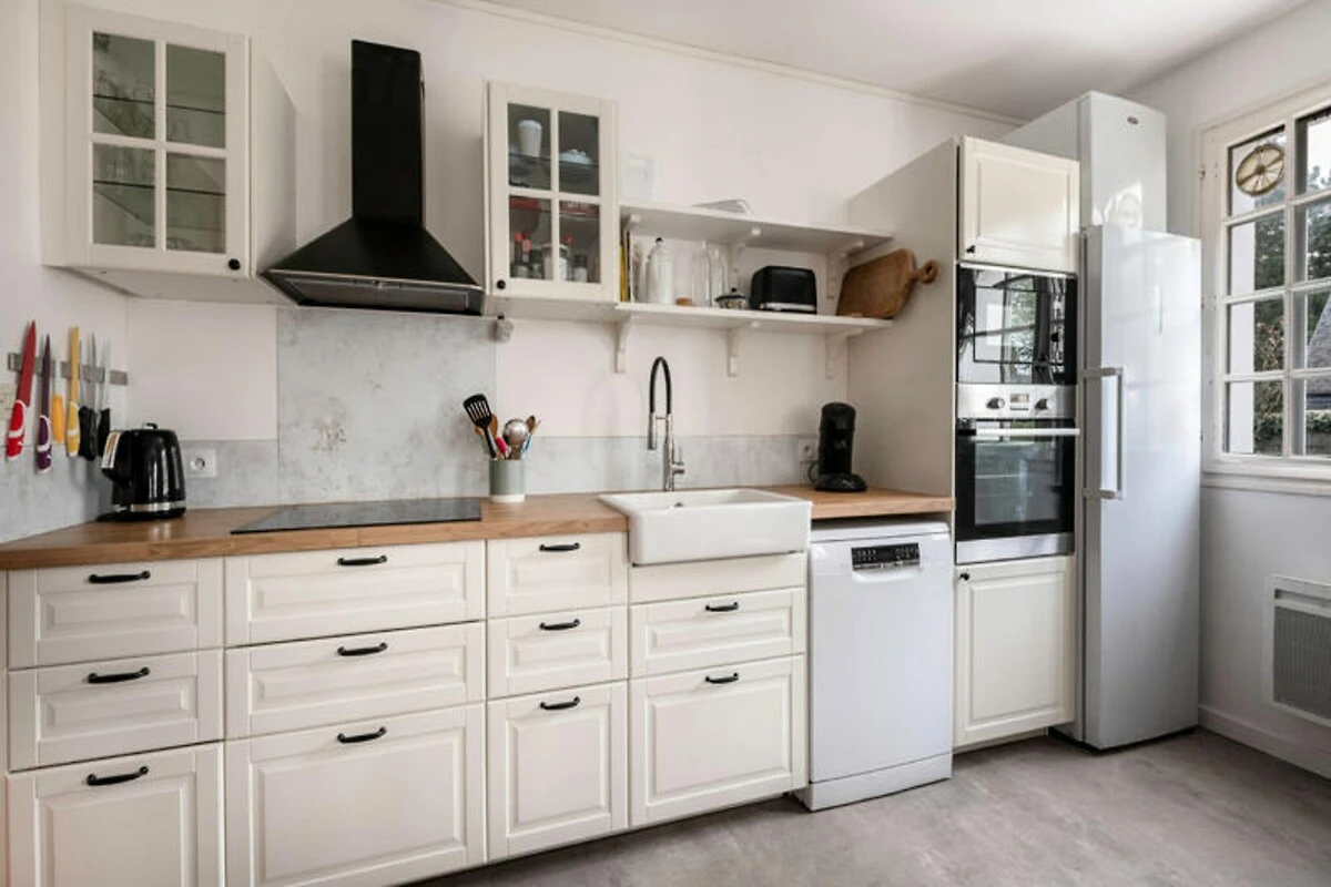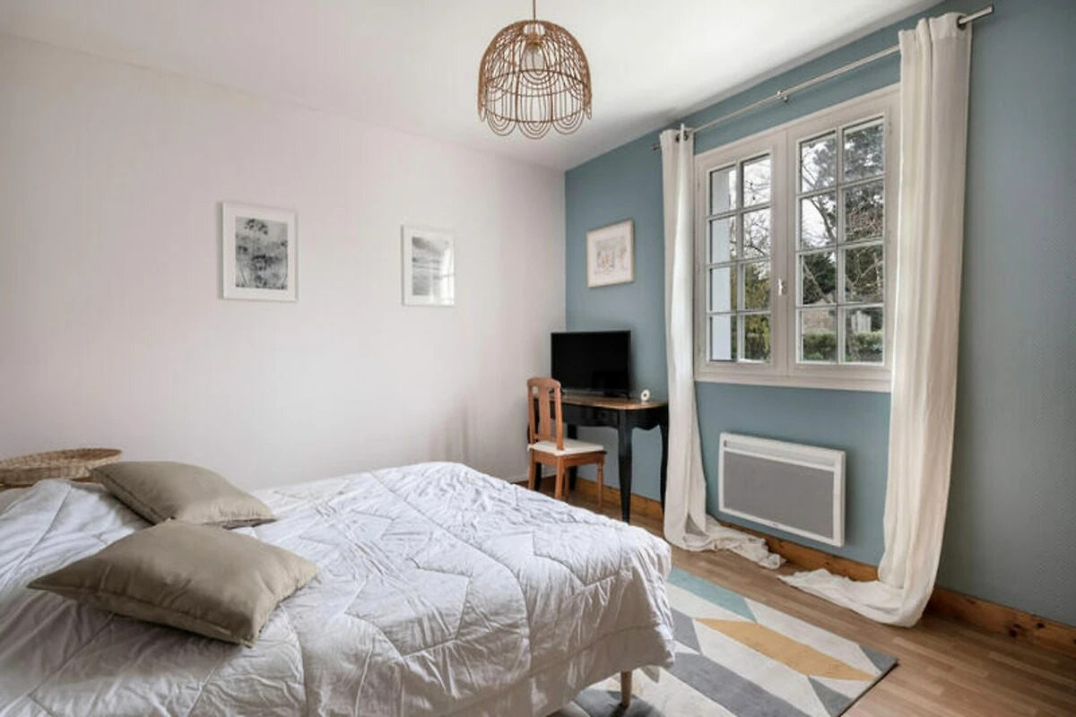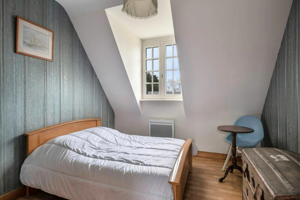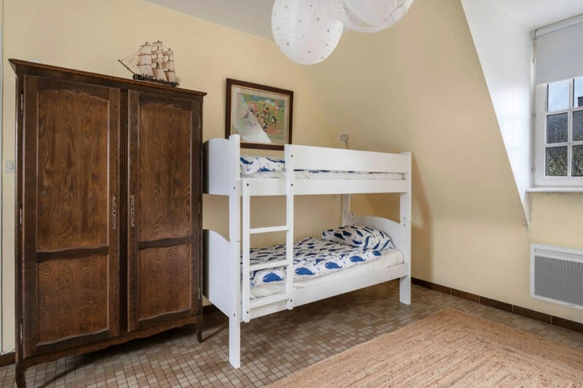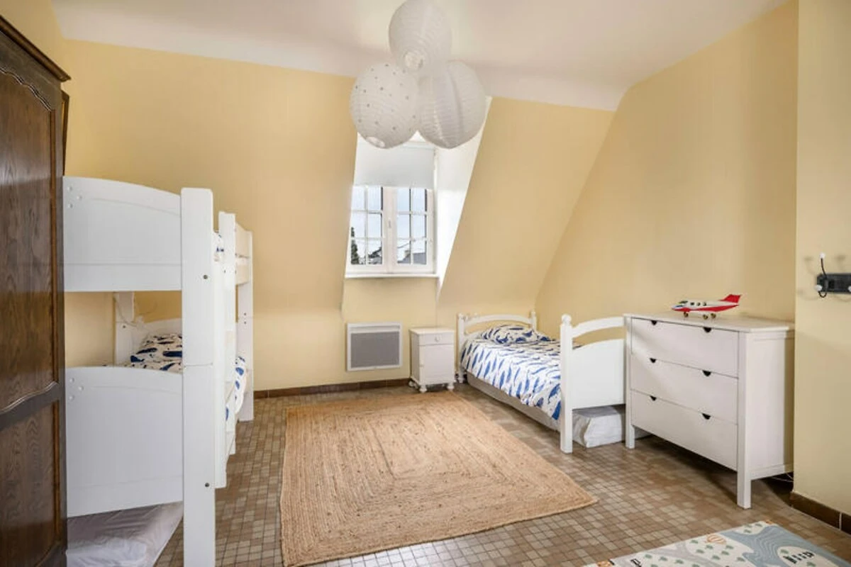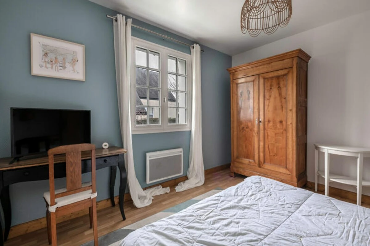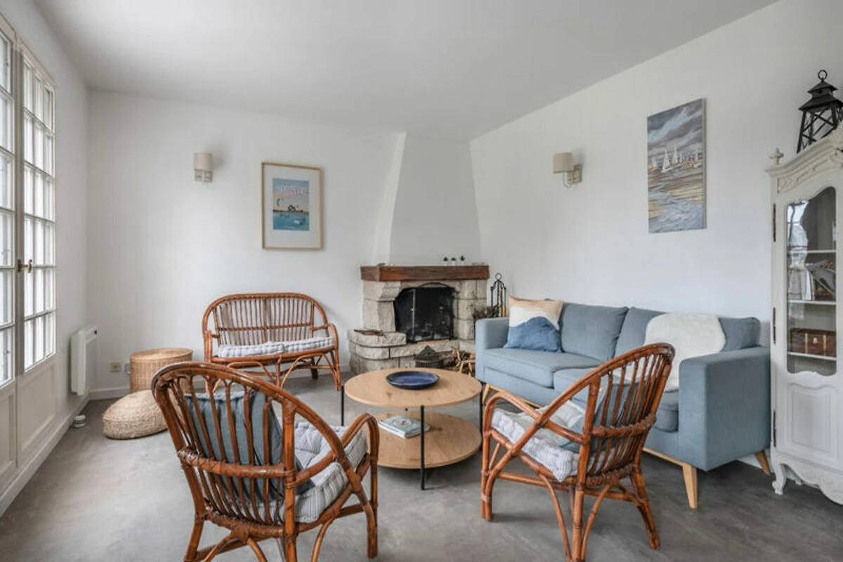 Stellen Sie sich vor, Sie wachen zum sanften Rauschen der Wellen und dem Duft der frischen Meeresluft auf, nur wenige Schritte vom Sandstrand von Saint Jacques entfernt. Dieses charmante 140 m² große Haus in Sarzeau bietet den perfekten Rückzugsort für Familien oder Freundesgruppen, die Entspannung und Abenteuer am Meer suchen. Mit Platz für bis zu 10 Gäste und der Möglichkeit, durch Anmietung des Nachbarhauses auf 15 Personen zu erweitern, ist dieses Anwesen ideal, um gemeinsam unvergessliche Erinnerungen zu schaffen. Ob Sie Ihr Frühstück im üppigen Garten genießen oder unter dem Sternenhimmel grillen – jeder Moment hier ist ein Fest der kleinen Freuden des Lebens. \n\nIm Inneren strahlt das Haus Wärme und Gemütlichkeit aus und verfügt über fünf liebevoll gestaltete Schlafzimmer. Zwei ruhige Zimmer im Erdgeschoss bieten große Doppelbetten und eine beruhigende weiß-blaue Einrichtung, während im Obergeschoss zwei weitere Doppelzimmer und ein fröhliches Kinderzimmer mit Etagenbett und Einzelbett für erholsame Nächte sorgen. Das geräumige Wohnzimmer lädt zum Entspannen bei einem Film oder angeregten Gesprächen ein, und die voll ausgestattete Küche macht das Zubereiten von Mahlzeiten zum Vergnügen. Moderne Annehmlichkeiten wie WLAN, eine Waschmaschine und ein Parkplatz sorgen für zusätzlichen Komfort während Ihres Aufenthalts. \n\nEntdecken Sie die Highlights von Sarzeau direkt vor der Tür. Der Strand Saint Jacques ist nur 400 Meter entfernt und lädt zum Sonnenbaden oder Muschelsammeln ein. In der Nähe befinden sich Restaurants wie Chti Billig und L’Endroit, die köstliche regionale Küche servieren. Der Supermarkt Carrefour Express mit allem Nötigen ist nur wenige Schritte entfernt. Unternehmen Sie einen Ausflug zum malerischen Strand Kercambre, dem Wasserpark AquaGolfe oder dem charmanten Städtchen Vannes. \n\nOb Sie Ruhe am Meer oder die lebendige Kultur der Region suchen – dieses Haus bietet Ihnen beides. Lassen Sie sich von der Schönheit der bretonischen Küste inspirieren und schaffen Sie unvergessliche Erinnerungen in diesem traumhaften Refugium.