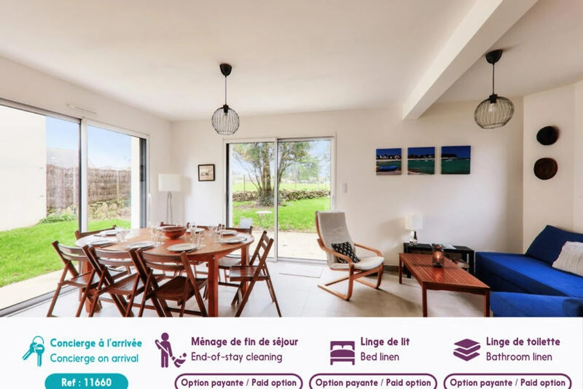 Im Herzen des malerischen Saint-Pierre-Quiberon, wo die Meeresbrise auf den Charme der Bretagne trifft, bietet dieses bezaubernde Haus einen ruhigen Rückzugsort für Familien und Freunde. Stellen Sie sich vor, wie Sie Ihre Morgen mit einem kurzen Spaziergang zum nur 600 Meter entfernten Sandstrand von Keraude beginnen oder sich in nahegelegenen Restaurants wie dem Chez Tante Phine mit frischen Meeresfrüchten verwöhnen lassen. Die Halbinsel Quiberon mit ihrer zerklüfteten Küste und den unberührten Stränden bildet die perfekte Kulisse für einen unvergesslichen Urlaub. Treten Sie ein in dieses wunderschön gestaltete Haus, dessen offener Wohnbereich durch große Fenster von natürlichem Licht durchflutet wird. Der Raum lädt zum Entspannen ein, sei es beim gemeinsamen Essen im Esszimmer, beim Faulenzen auf dem gemütlichen Sofa oder beim Zubereiten kulinarischer Köstlichkeiten in der voll ausgestatteten Küche. Mit modernen Geräten wie Induktionskochfeld, Backofen, Geschirrspüler und Kaffeemaschine wurde an jedes Detail gedacht, um Ihren Komfort zu gewährleisten. Der Außenbereich ist eine Oase der Entspannung, perfekt für den morgendlichen Kaffee, ein Barbecue oder einfach zum Sonnenbaden mit einem guten Buch. Das Haus bietet Platz für bis zu acht Gäste und verfügt über vier einladende Schlafzimmer, eines im Erdgeschoss und drei im Obergeschoss mit charmanten Dachschrägen. Zusätzliche Annehmlichkeiten wie Badezimmer, Duschbad, separates WC, Waschmaschine und zwei Parkplätze machen dieses Haus ebenso praktisch wie einladend. Die Halbinsel Quiberon bietet unzählige Möglichkeiten zur Erkundung. Entdecken Sie malerische Küstenwege, Kunsthandwerksläden und den lebendigen Charme des nahegelegenen Quiberon. Für eine wahre Auszeit empfiehlt sich ein Ausflug nach Belle-Île-en-Mer, Île-d'Houat oder Île Hoëdic, wo Sie atemberaubende Landschaften erwarten. Ob Sie Abenteuer oder Ruhe suchen – dieses Haus ist Ihr Tor zu den schönsten Seiten der Bretagne.