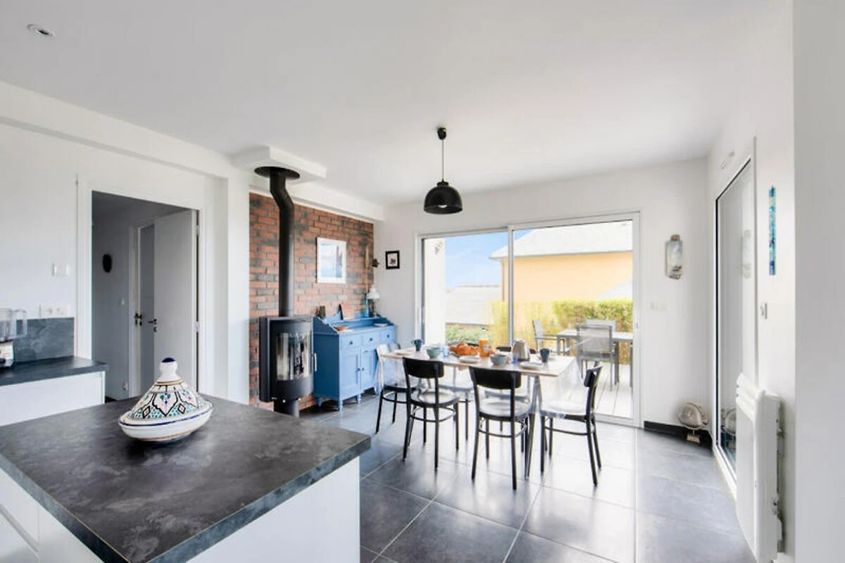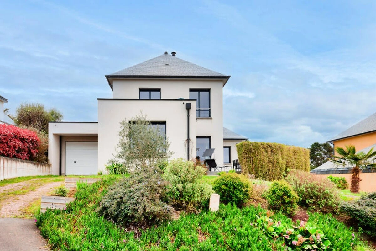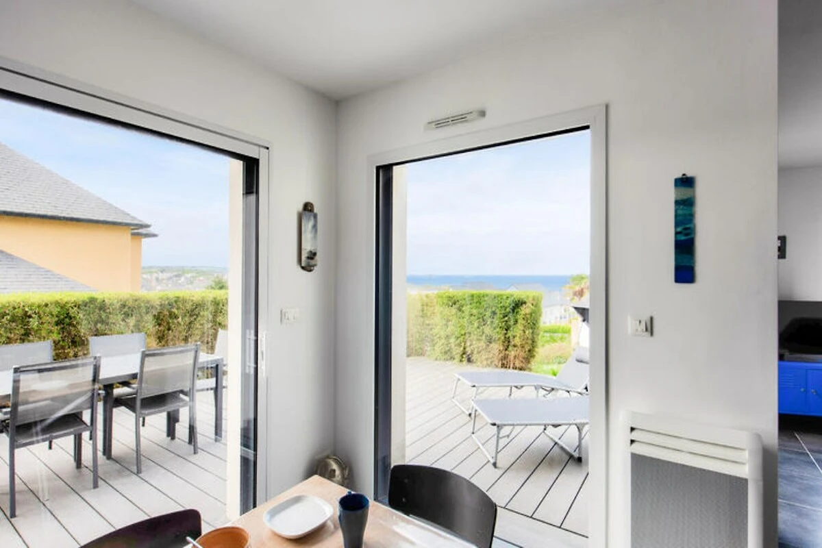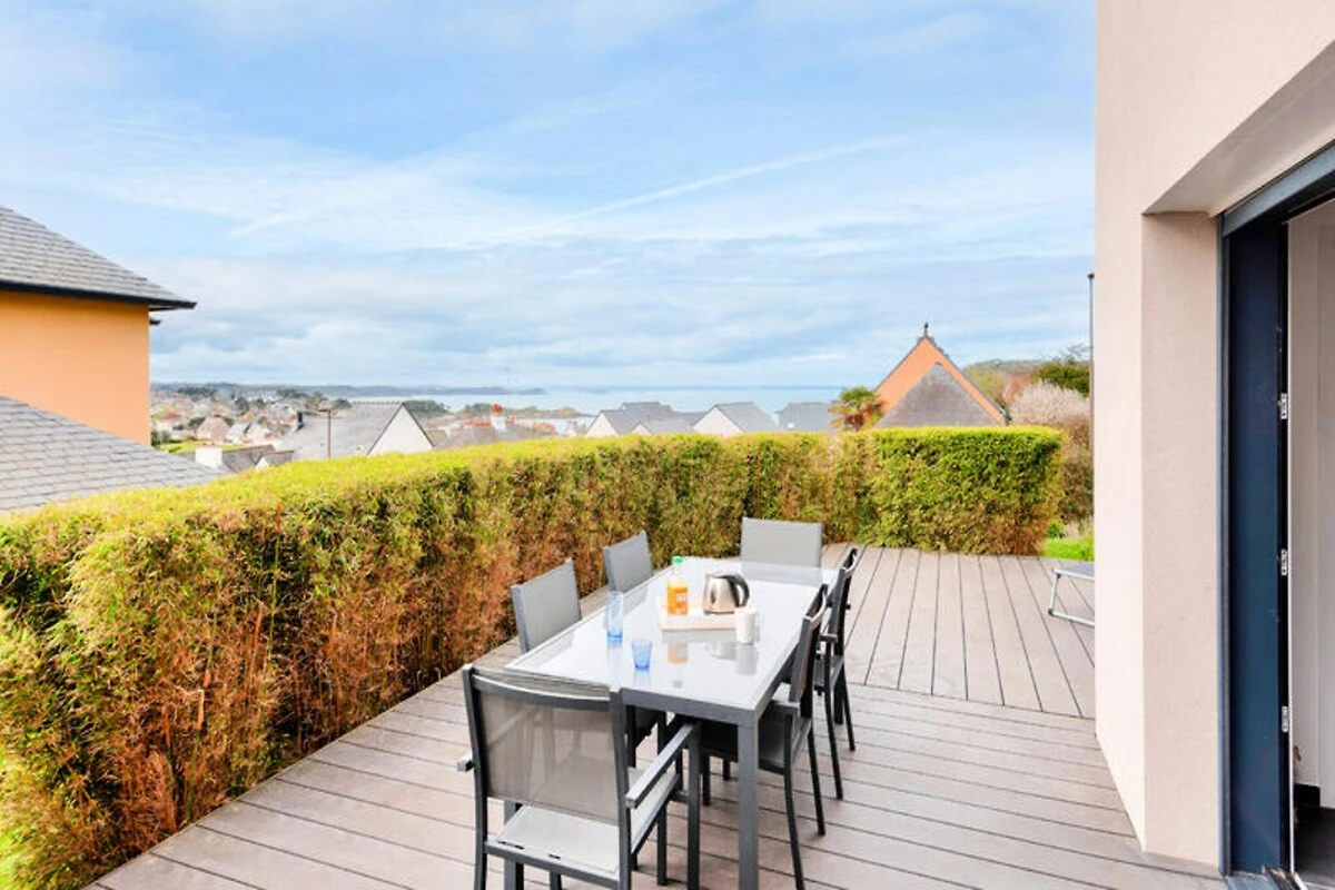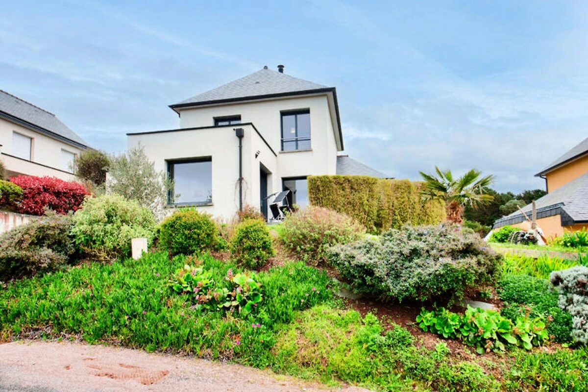 Hoch oben auf den malerischen Hügeln über Erquy lädt dieses moderne Ferienhaus Sie ein, in die natürliche Schönheit der Côtes d'Armor in der Bretagne einzutauchen. Beginnen Sie Ihren Morgen auf der Terrasse mit einer dampfenden Tasse Kaffee, dem Blick auf das glitzernde Meer und der sanften Meeresbrise – der perfekte Start in einen Tag voller Entdeckungen und Entspannung. Hier trifft Ruhe auf Abenteuer und bietet Ihnen eine wahre Auszeit vom Alltag. Treten Sie ein und entdecken Sie einen hellen und luftigen Wohnbereich, der mit Blick auf Komfort und Stil gestaltet wurde. Die großen Fenster durchfluten den Raum mit natürlichem Licht und schaffen eine fließende Verbindung zwischen Innen und Außen. Die offene Küche ist komplett ausgestattet mit allem, was Sie zum Zubereiten köstlicher Mahlzeiten benötigen, vom Induktionskochfeld über den Geschirrspüler bis hin zur Kaffeemaschine. Genießen Sie ein gemeinsames Essen mit der Familie am Esstisch oder entspannen Sie sich im gemütlichen Wohnbereich bei einem Filmabend. Auch die Schlafmöglichkeiten sind einladend: Drei geräumige Schlafzimmer erwarten Sie. Das Schlafzimmer im Erdgeschoss verfügt über zwei Einzelbetten, die zu einem Doppelbett zusammengestellt werden können, und ein eigenes Badezimmer. Im Obergeschoss bieten zwei weitere Schlafzimmer mit Queensize-Betten und eine Galerie erholsame Rückzugsorte nach einem erlebnisreichen Tag.