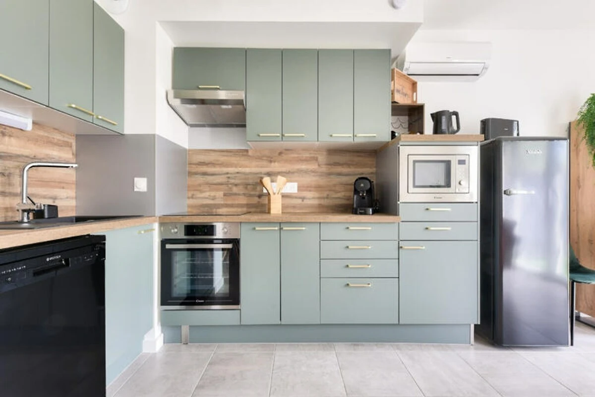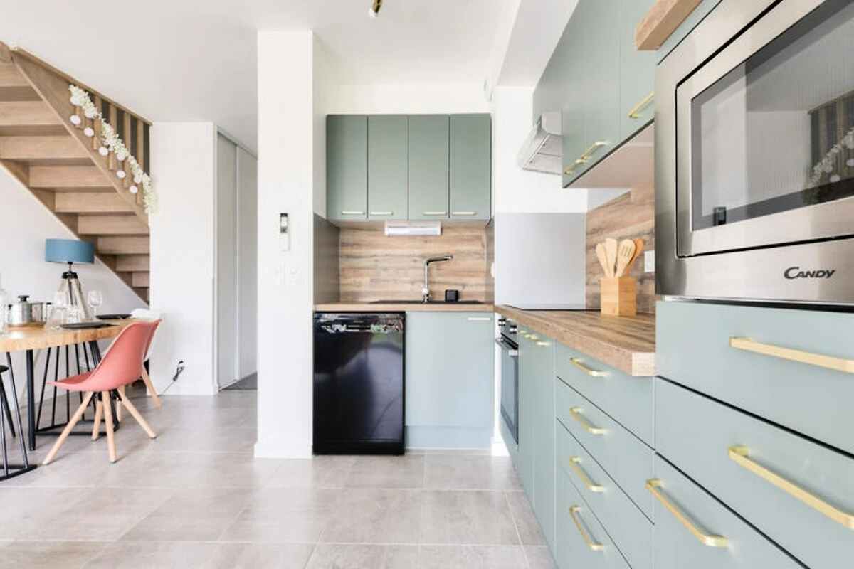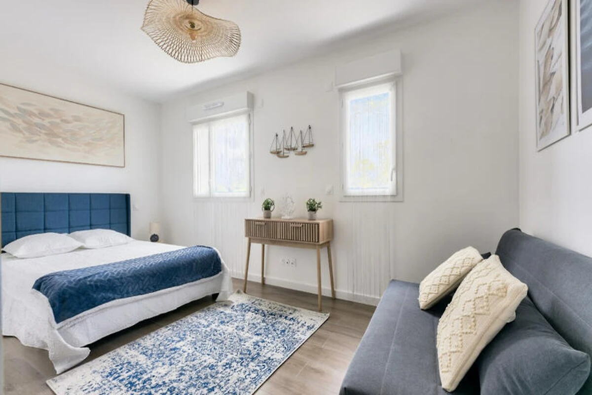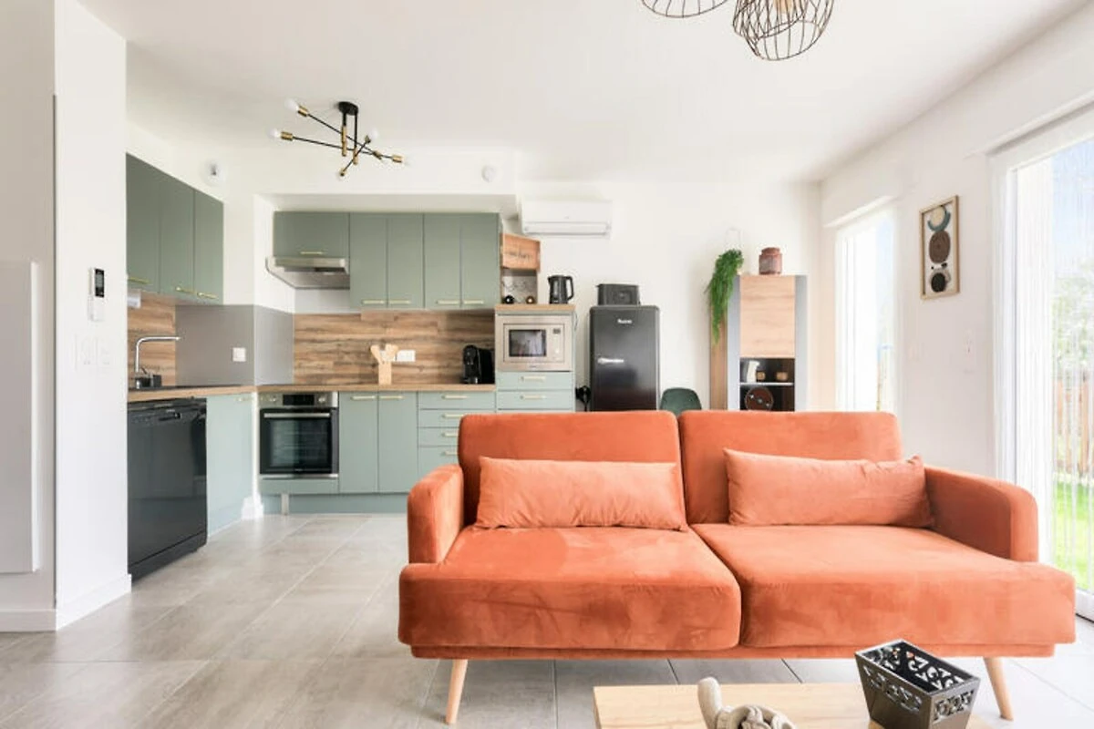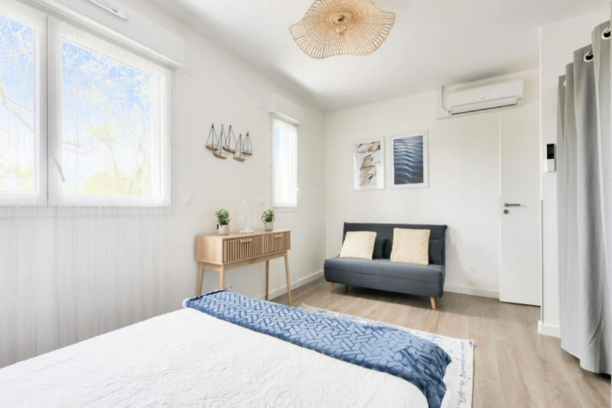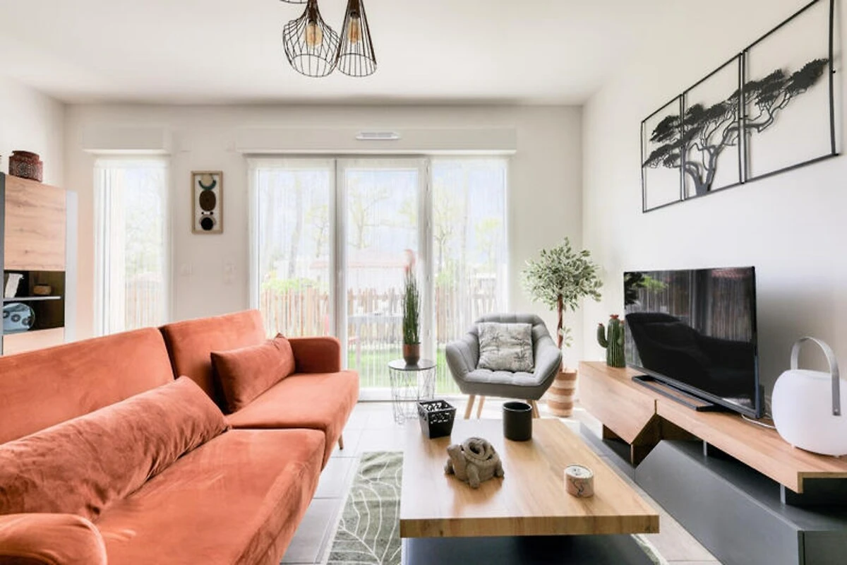 Mitten im charmanten Küstenort Andernos-les-Bains lädt dieses entzückende Haus dazu ein, unvergessliche Momente mit Familie oder Freunden zu erleben. Umgeben von einem üppigen Garten bietet es den perfekten Rahmen für sonnige Mittagessen und lange Sommerabende am Grill, wo Lachen und gutes Essen unter freiem Himmel zusammenkommen. Die ruhige Atmosphäre des Anwesens spiegelt die friedliche Schönheit der Bucht von Arcachon wider und bietet eine Oase der Entspannung und Freude. \n\nTreten Sie ein und lassen Sie sich von einem modernen Interieur in sanften Pastelltönen empfangen. Das Wohnzimmer mit seinem einladenden ockerfarbenen Sofa ist ein gemütlicher Ort zum Entspannen, Geschichten austauschen oder eine Tasse Kaffee genießen. Der Essbereich ist ideal für gesellige Mahlzeiten, und die voll ausgestattete offene Küche bietet alles, was Sie für Ihre kulinarische Kreativität benötigen – vom Cerankochfeld bis zum Geschirrspüler. Der Schlafbereich umfasst zwei geräumige Schlafzimmer: eines mit einem komfortablen Doppelbett und das andere mit einem Doppelbett und einem Schlafsofa, sodass alle erholsame Nächte genießen können. Ein modernes Duschbad sorgt für zusätzlichen Komfort, während Annehmlichkeiten wie Waschmaschine, Trockner und Parkplätze Ihren Aufenthalt angenehmer gestalten.\n\nNur 3 km von den Sandstränden entfernt und in der Nähe von Restaurants und Geschäften gelegen, ist dieses Haus der ideale Ausgangspunkt, um das pulsierende Leben von Andernos-les-Bains zu entdecken. Schlendern Sie über die berühmte 232 Meter lange Seebrücke, genießen Sie frische Austern im Yachthafen oder tauchen Sie ein in die natürliche Schönheit der Region bei Wassersport und auf malerischen Wanderwegen. Für Tagesausflüge bietet sich die lebhafte Stadt Bordeaux an, die nur 37 km entfernt liegt und eine gelungene Mischung aus Kultur und Gastronomie bietet.\n\nOb Sie Entspannung am Meer oder authentische Erlebnisse vor Ort suchen – diese 4-Sterne-Unterkunft verspricht einen herzlichen und einladenden Aufenthalt. Dank des Concierge-Services, der Ihnen während Ihres gesamten Aufenthalts zur Verfügung steht, wird sich um jedes Detail gekümmert, sodass Sie einen stressfreien und unvergesslichen Urlaub genießen können.