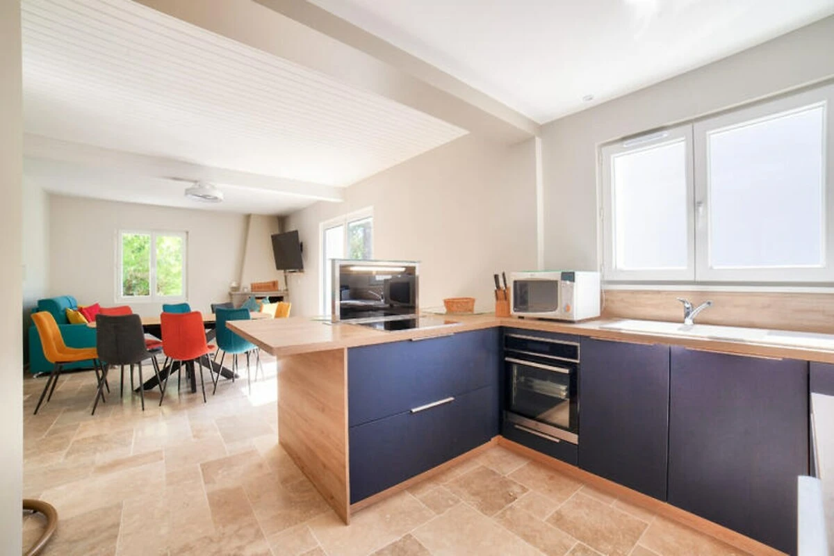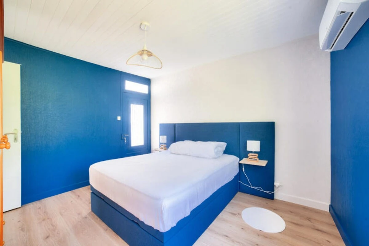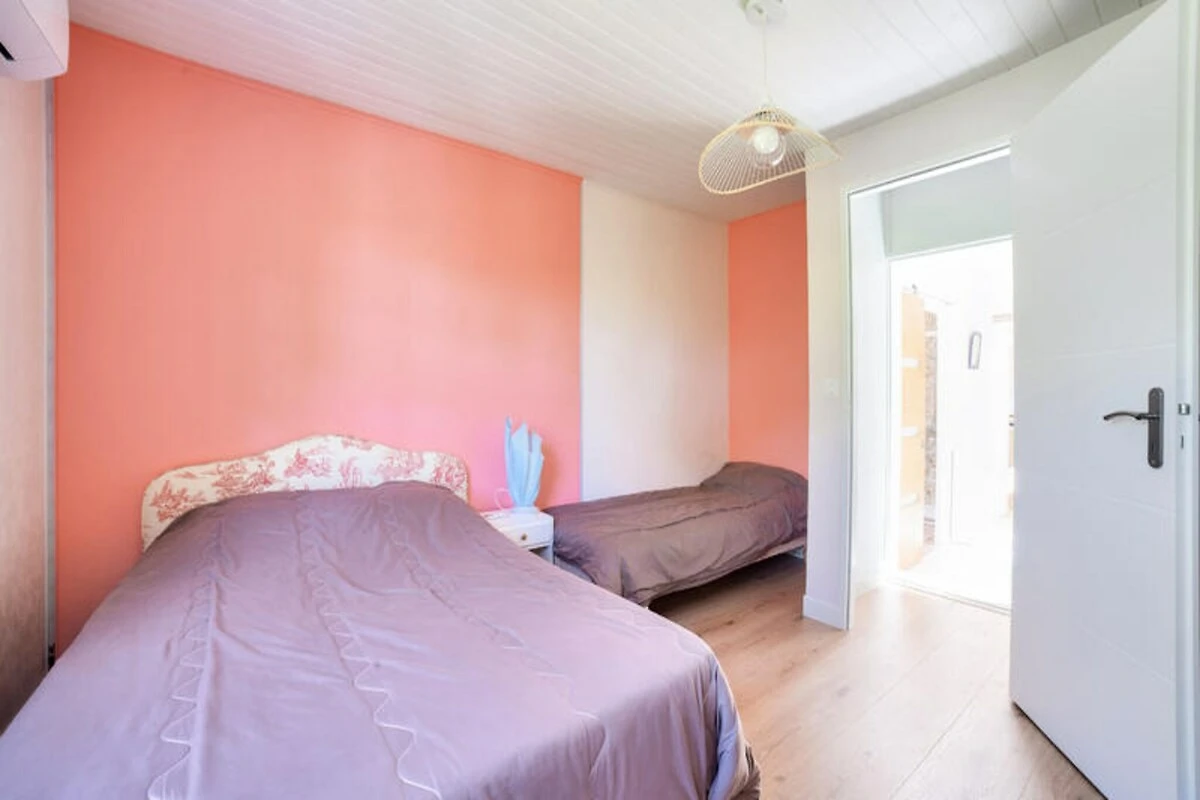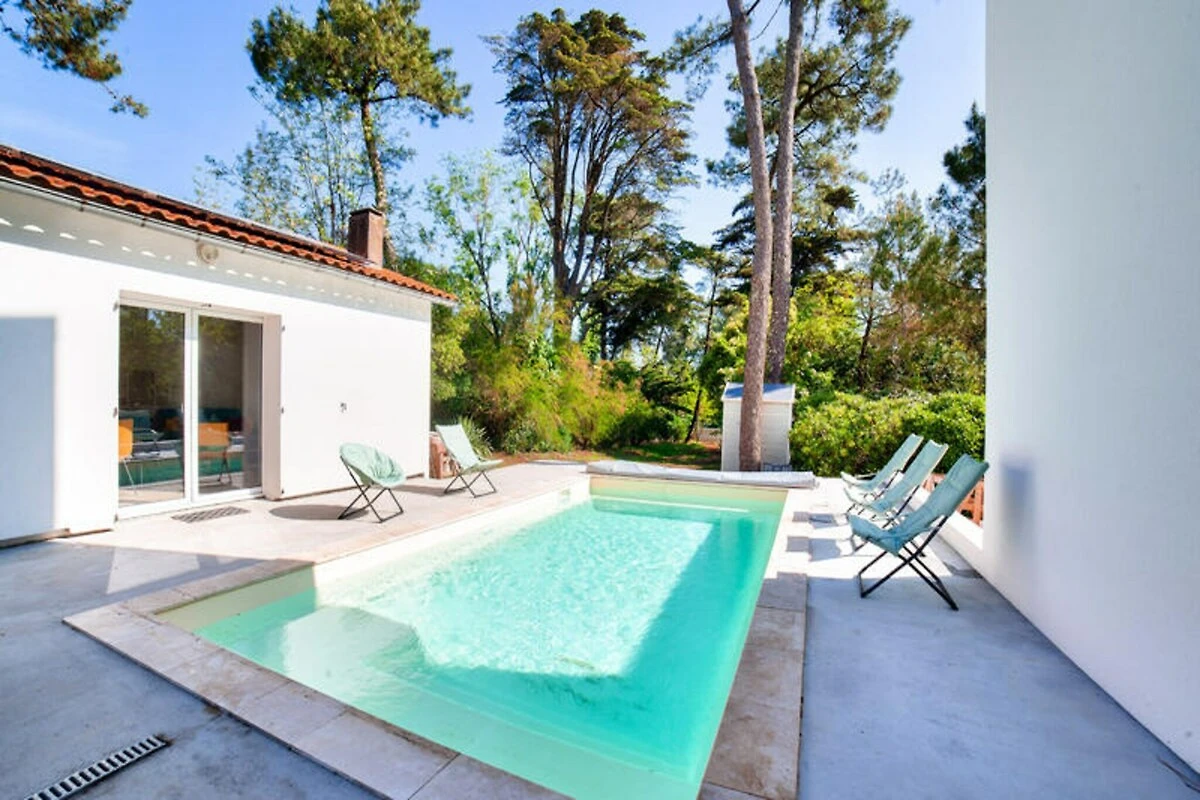 Stellen Sie sich vor, Sie erwachen zum sanften Rauschen der Wellen und dem Duft der Pinien in der idyllischen Umgebung von L'Aiguillon-la-Presqu'île. Dieses charmante Ferienhaus bietet direkten Zugang zur Lagune Belle-Henriette, einem unberührten Küstenparadies, umgeben von Dünen und unberührter Natur. Ob Sie am Sandstrand entlangspazieren oder das nahegelegene Naturschutzgebiet erkunden – hier genießen Sie jeden Moment der Ruhe. Die Gegend ist mit ihrer reichen Artenvielfalt und friedlichen Atmosphäre ideal für Familien und Naturliebhaber. \n\nDas Anwesen selbst ist eine Oase des Komforts und Stils. Der Außenbereich verfügt über einen privaten Pool, der von Mai bis September geöffnet ist und in dem Sie schwimmen, sonnenbaden oder einfach im Schatten der Pinien entspannen können. Die Terrasse und die Gartenmöbel bieten den perfekten Rahmen für Mahlzeiten im Freien oder zum Entspannen bei einem erfrischenden Getränk. Im Inneren empfängt Sie ein lebendiger und einladender Wohnbereich mit einem gemütlichen blauen Sofa im Wohnzimmer und einem Esszimmer, das zum gemeinsamen Essen einlädt. Die moderne Küche ist komplett ausgestattet mit allem, was Sie brauchen – vom Induktionskochfeld bis zur Nespresso-Maschine. So wird die Zubereitung Ihrer Mahlzeiten zum Vergnügen.\n\nDas Haus bietet Platz für bis zu fünf Gäste in zwei liebevoll eingerichteten Schlafzimmern. Das orangefarbene Zimmer verfügt über ein Doppelbett und ein Einzelbett, während das blaue Zimmer mit einem großen Doppelbett für erholsame Nächte sorgt. Ein elegantes Badezimmer mit Haartrockner und Waschmaschine bietet zusätzlichen Komfort, und die Klimaanlage garantiert angenehme Temperaturen während Ihres gesamten Aufenthalts. Dank fünf Parkplätzen können Sie die Umgebung bequem erkunden.\n\nNur 50 Meter von der Lagune Belle-Henriette entfernt und in der Nähe von Sandstränden, Supermärkten, Restaurants und sogar einem Golfplatz gelegen, ist diese Unterkunft der perfekte Ausgangspunkt für einen unvergesslichen Urlaub. Ob Sie Vögel im Naturschutzgebiet beobachten, mit der Familie im Luna Park Spaß haben oder die lokale Küche genießen – L'Aiguillon-la-Presqu'île verspricht ein unvergessliches Erlebnis. Buchen Sie Ihren Aufenthalt und tauchen Sie ein in die Schönheit der Vendée.