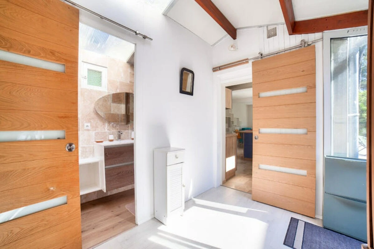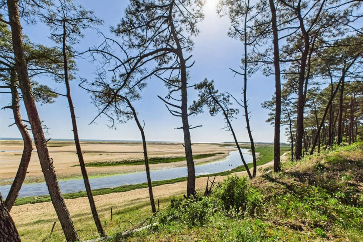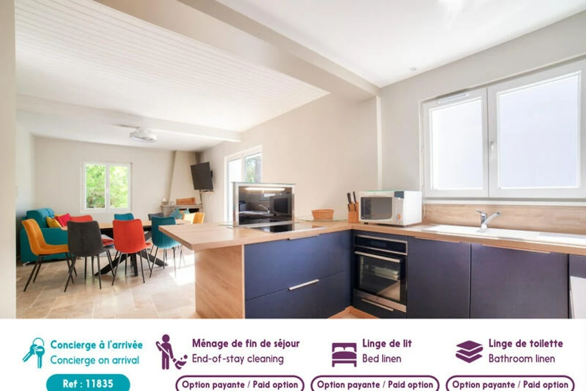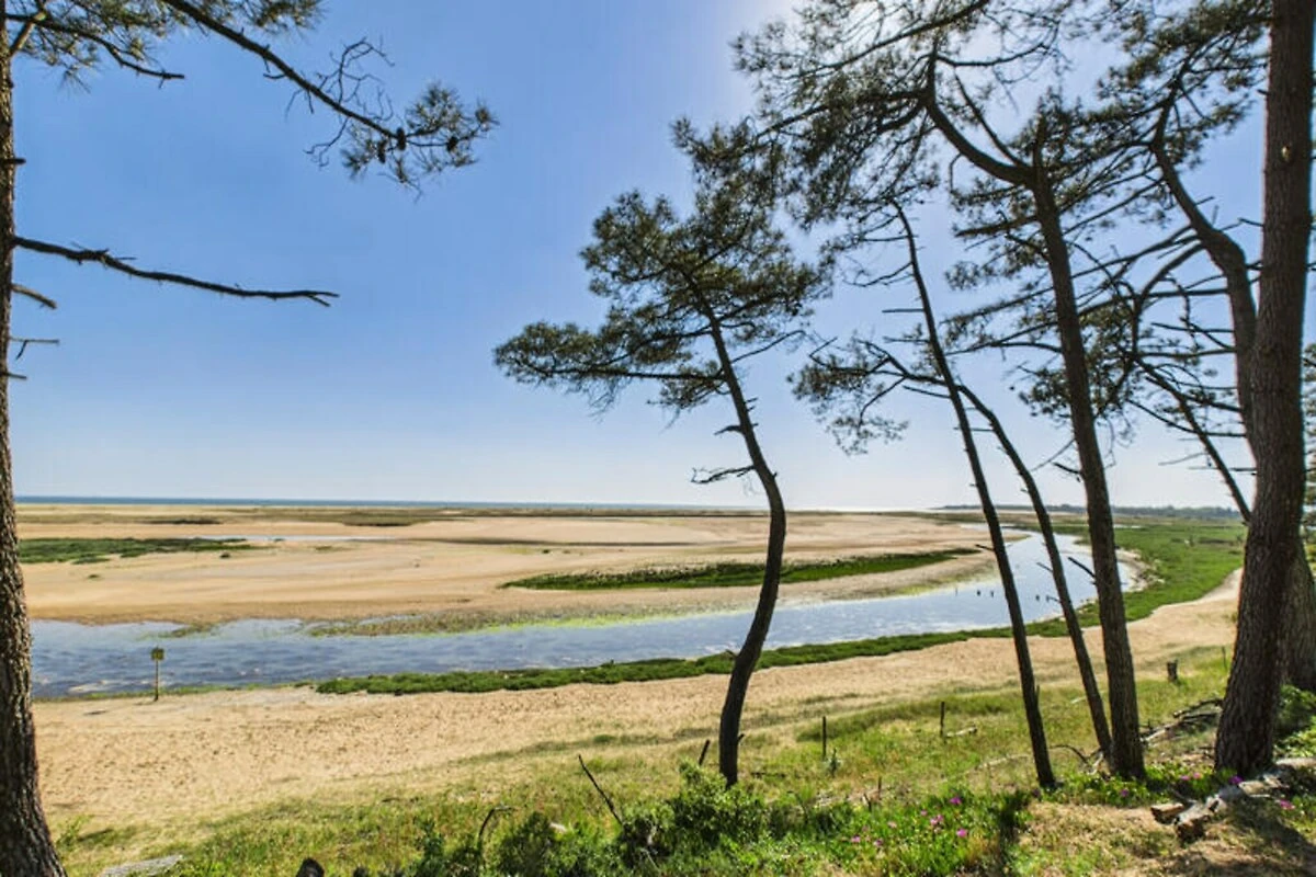 Stellen Sie sich vor, Sie erwachen zum sanften Rauschen der Wellen und dem Duft der Pinien in der idyllischen Umgebung von L'Aiguillon-la-Presqu'île. Dieses charmante Ferienhaus bietet direkten Zugang zur Lagune Belle-Henriette, einem unberührten Küstenparadies, umgeben von Dünen und unberührter Natur. Ob Sie am Sandstrand entlangspazieren oder das nahegelegene Naturschutzgebiet erkunden – hier genießen Sie jeden Moment der Ruhe. Die Gegend ist mit ihrer reichen Artenvielfalt und friedlichen Atmosphäre ideal für Familien und Naturliebhaber. \n\nDas Anwesen selbst ist eine Oase des Komforts und Stils. Der Außenbereich verfügt über einen privaten Pool, der von Mai bis September geöffnet ist und in dem Sie schwimmen, sonnenbaden oder einfach im Schatten der Pinien entspannen können. Die Terrasse und die Gartenmöbel bieten den perfekten Rahmen für Mahlzeiten im Freien oder zum Entspannen bei einem erfrischenden Getränk. Im Inneren empfängt Sie ein lebendiger und einladender Wohnbereich mit einem gemütlichen blauen Sofa im Wohnzimmer und einem Esszimmer, das zum gemeinsamen Essen einlädt. Die moderne Küche ist komplett ausgestattet mit allem, was Sie brauchen – vom Induktionskochfeld bis zur Nespresso-Maschine. So wird die Zubereitung Ihrer Mahlzeiten zum Vergnügen.\n\nDas Haus bietet Platz für bis zu fünf Gäste in zwei liebevoll eingerichteten Schlafzimmern. Das orangefarbene Zimmer verfügt über ein Doppelbett und ein Einzelbett, während das blaue Zimmer mit einem großen Doppelbett für erholsame Nächte sorgt. Ein elegantes Badezimmer mit Haartrockner und Waschmaschine bietet zusätzlichen Komfort, und die Klimaanlage garantiert angenehme Temperaturen während Ihres gesamten Aufenthalts. Dank fünf Parkplätzen können Sie die Umgebung bequem erkunden.\n\nNur 50 Meter von der Lagune Belle-Henriette entfernt und in der Nähe von Sandstränden, Supermärkten, Restaurants und sogar einem Golfplatz gelegen, ist diese Unterkunft der perfekte Ausgangspunkt für einen unvergesslichen Urlaub. Ob Sie Vögel im Naturschutzgebiet beobachten, mit der Familie im Luna Park Spaß haben oder die lokale Küche genießen – L'Aiguillon-la-Presqu'île verspricht ein unvergessliches Erlebnis. Buchen Sie Ihren Aufenthalt und tauchen Sie ein in die Schönheit der Vendée.
