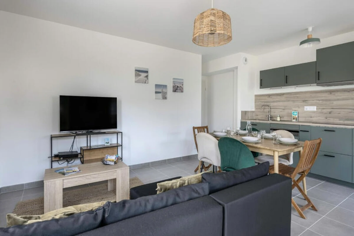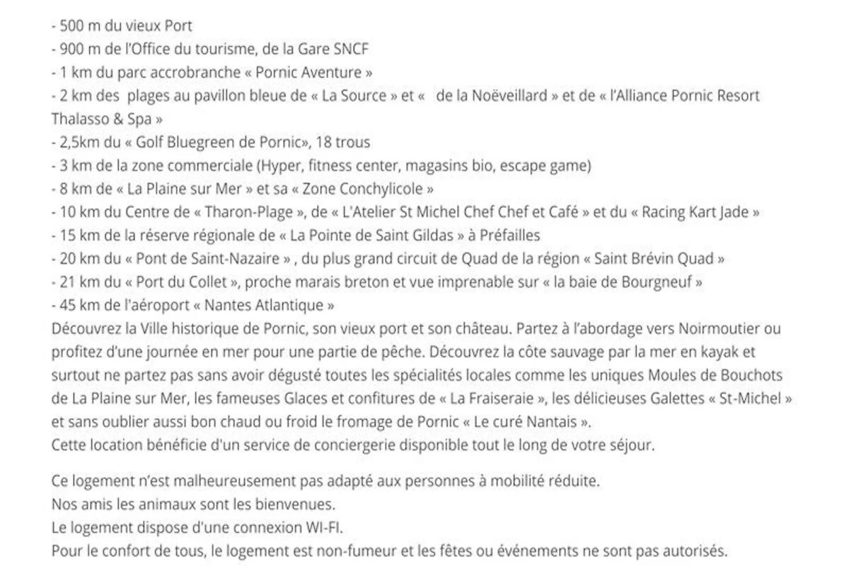 Tauchen Sie ein in den Küstencharme der Loire-Atlantique mit diesem charmanten Erdgeschoss-Apartment in Pornic, einem Städtchen voller Küstengeschichte und lebendiger Kultur. Stellen Sie sich vor, wie Sie am Canal de la Haute Perche entlangspazieren oder den üppigen botanischen Park direkt vor Ihrer Tür erkunden, wo exotische Pflanzen eine Oase der Ruhe bilden. Ob Sie Abenteuer oder Entspannung suchen – diese Unterkunft ist der perfekte Ausgangspunkt, um die Schätze der Jadeküste zu entdecken. Vom alten Hafen über den lebhaften Markt bis hin zum Casino ist alles bequem zu erreichen und lädt Sie ein, den authentischen Rhythmus des Lebens in Pornic zu erleben. \n\nDas 80 m² große, durchdacht gestaltete Apartment bietet komfortabel Platz für bis zu sechs Gäste in drei Doppelzimmern mit jeweils bequemen 160 cm breiten Betten. Die offene Küche ist komplett mit modernen Geräten ausgestattet, darunter Induktionskochfeld, Backofen, Mikrowelle, Geschirrspüler und Kaffeemaschine, sodass Sie sich wie zu Hause fühlen werden. Das helle Wohnzimmer öffnet sich zu einer privaten Terrasse und einem umzäunten Garten mit Gartenmöbeln und Elektrogrill – ideal für Mahlzeiten im Freien. WLAN, ein Fernseher, ein Reisebett und ein Haartrockner sorgen für zusätzlichen Komfort, während eine private Doppelgarage sichere Parkplätze für Ihr Auto und Ihre Fahrräder bietet. Nur 200 Meter von Restaurants und dem Casino entfernt und nur wenige Gehminuten vom alten Hafen und den mit der Blauen Flagge ausgezeichneten Stränden bietet dieses Apartment unvergleichlichen Komfort. Erkunden Sie die historische Burg von Pornic, unternehmen Sie eine Kajaktour entlang der zerklüfteten Küste oder genießen Sie lokale Spezialitäten wie Bouchot-Muscheln und St-Michel-Galettes. Zu den nahegelegenen Attraktionen zählen der Baumwipfelpark Pornic Adventure, der Golfplatz Bluegreen und das renommierte Alliance Pornic Resort Thalasso & Spa. Für Tagesausflüge bieten sich das Naturschutzgebiet Pointe de Saint Gildas oder ein Segeltörn nach Noirmoutier an. Ob Sie die atemberaubenden Landschaften, die lebendige Kultur oder einfach nur die Ruhe am Meer genießen möchten – dieses Apartment verspricht einen unvergesslichen Aufenthalt. Haustiere sind willkommen, und ein Concierge-Service sorgt für einen reibungslosen Ablauf. Schaffen Sie Erinnerungen, die ein Leben lang halten, in diesem idyllischen Küstenrefugium.